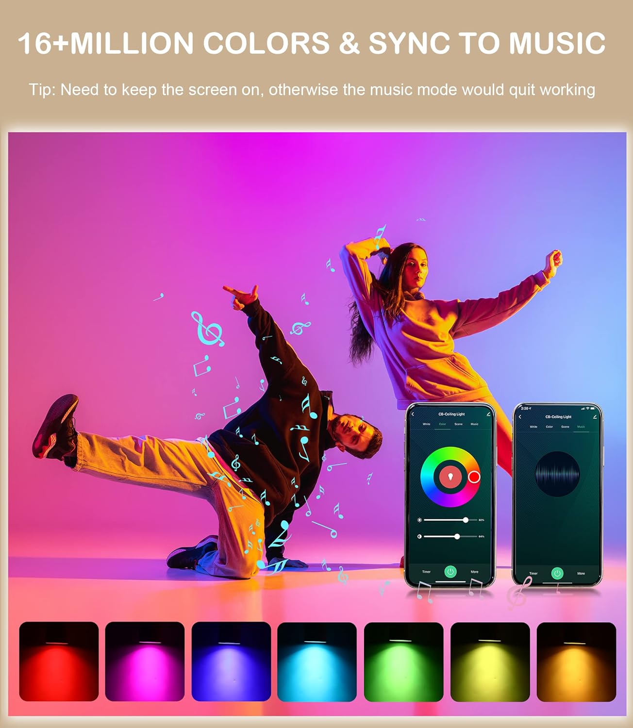【Music Sync +8 Scenarios】 With wide range of CCT and RGB color, the light is available to 8 scenarios, which meets your different lighting needs, reading, working, sleeping or dancing etc. You can also make it sync to music, lighting would follow the change of the music beats, having fun with family and friends now!