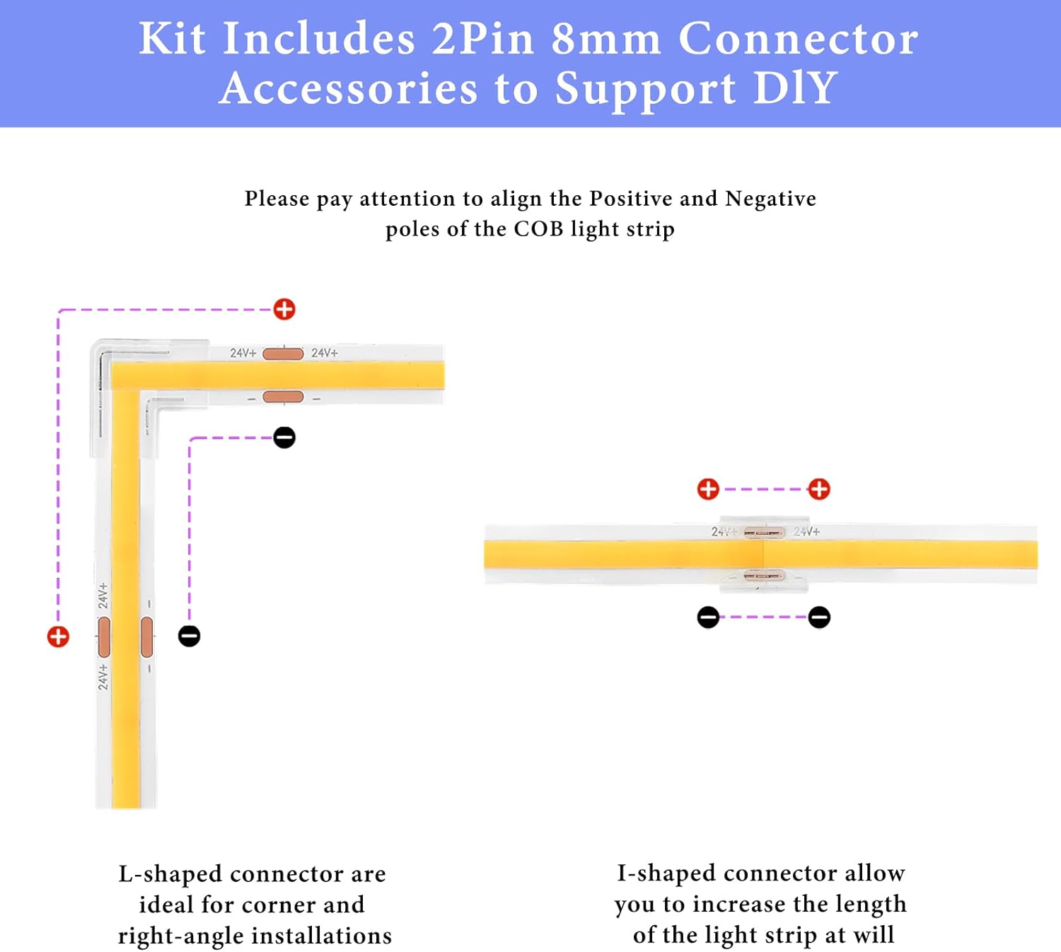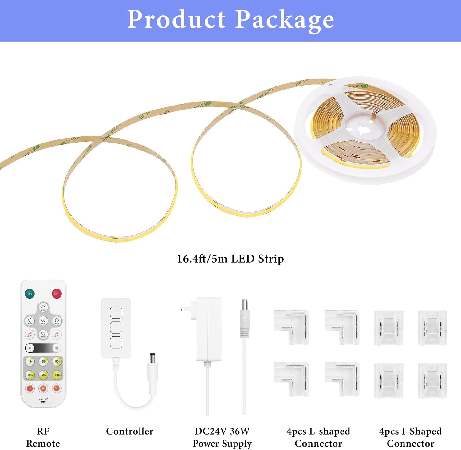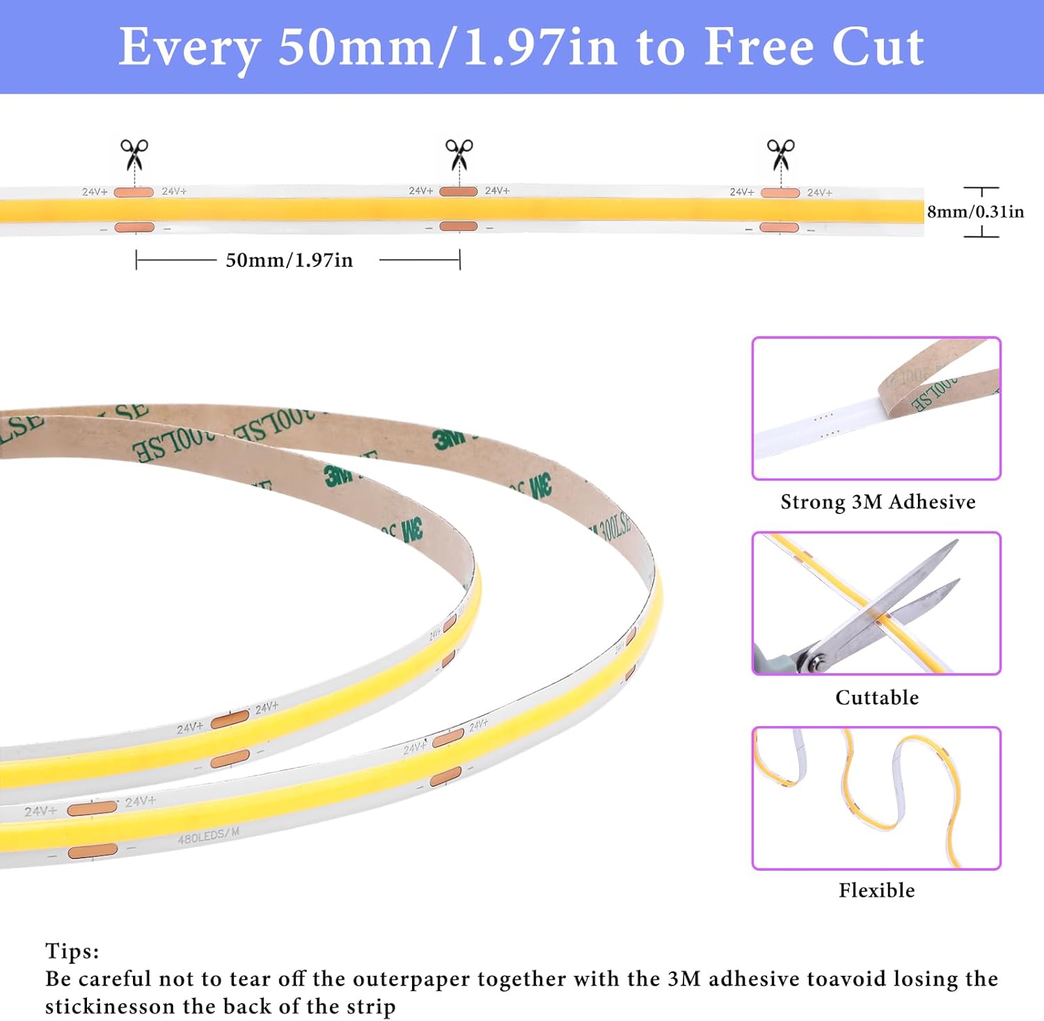 COB LED Strip Light: Featuring 480 LEDs/m(total 2400 LEDs), this light strip delivers a bright, uniform illumination with a 180-degree beam angle. This ensures wider coverage and softer lighting compared to traditional SMD strips