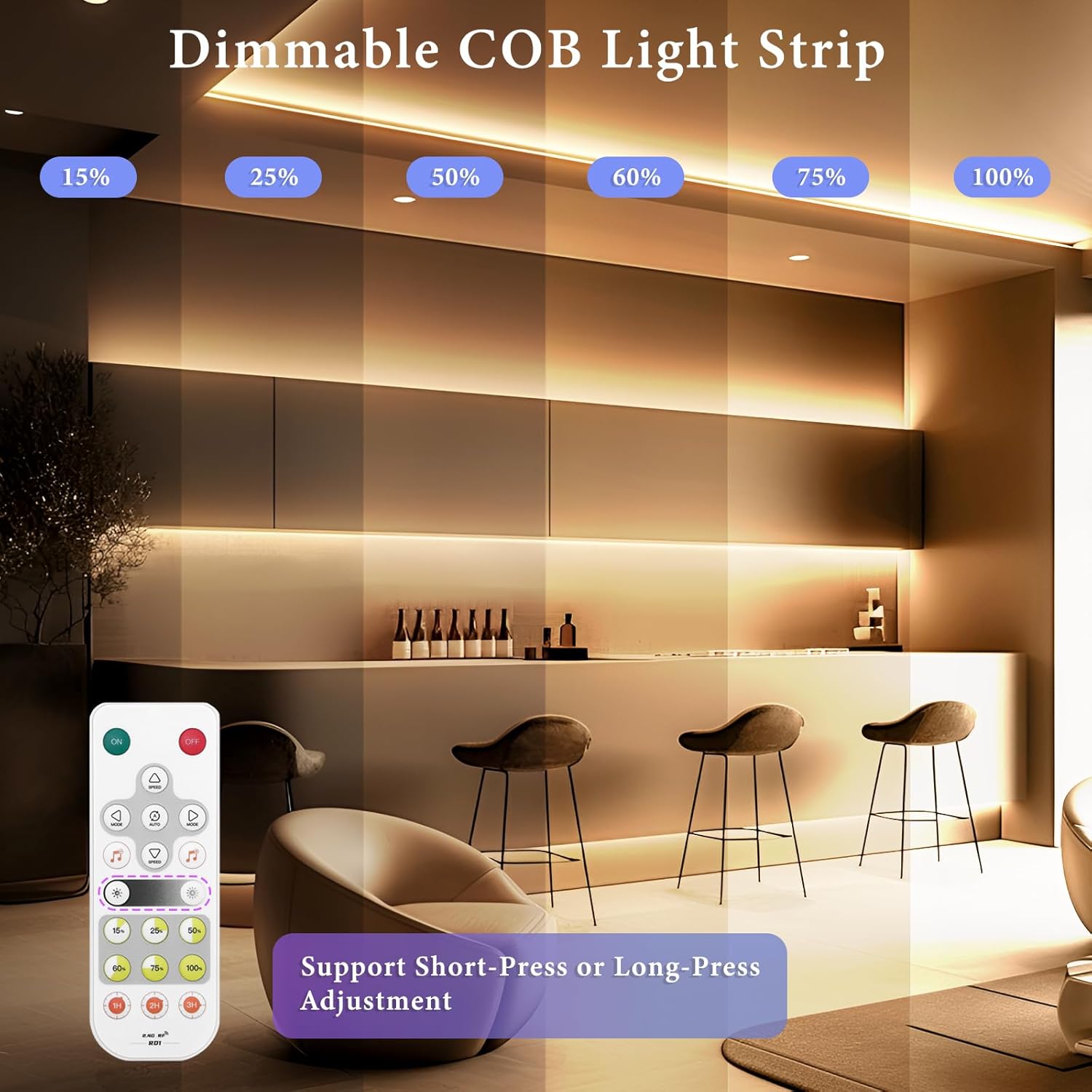 Durable & Easy to Install: Rigorously tested for up to 50,000 hours of performance, these COB LED strip lights come with strong 3M adhesive tape for quick mounting. NOTE: When lighting for a long time, please unfold the light strip to avoid damage