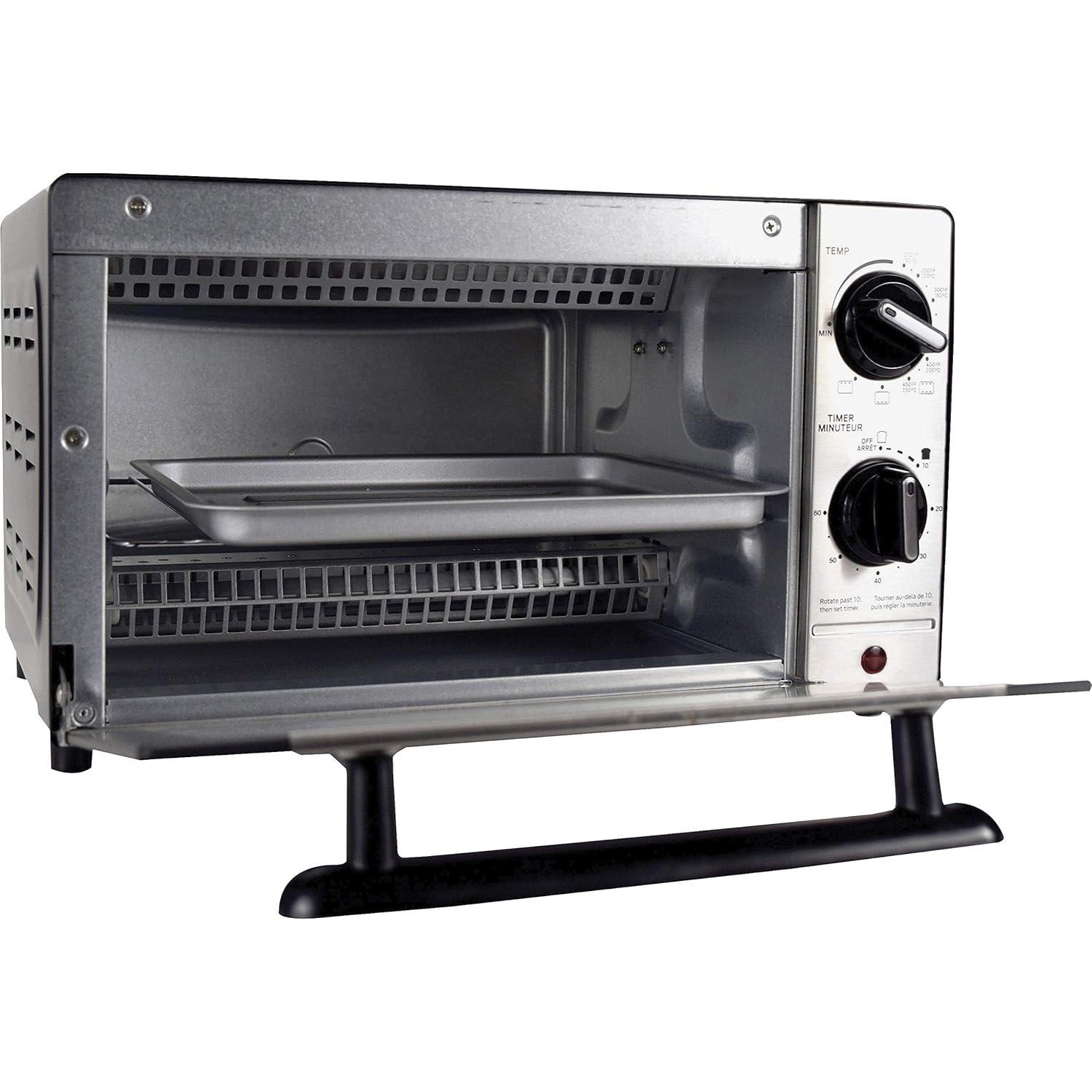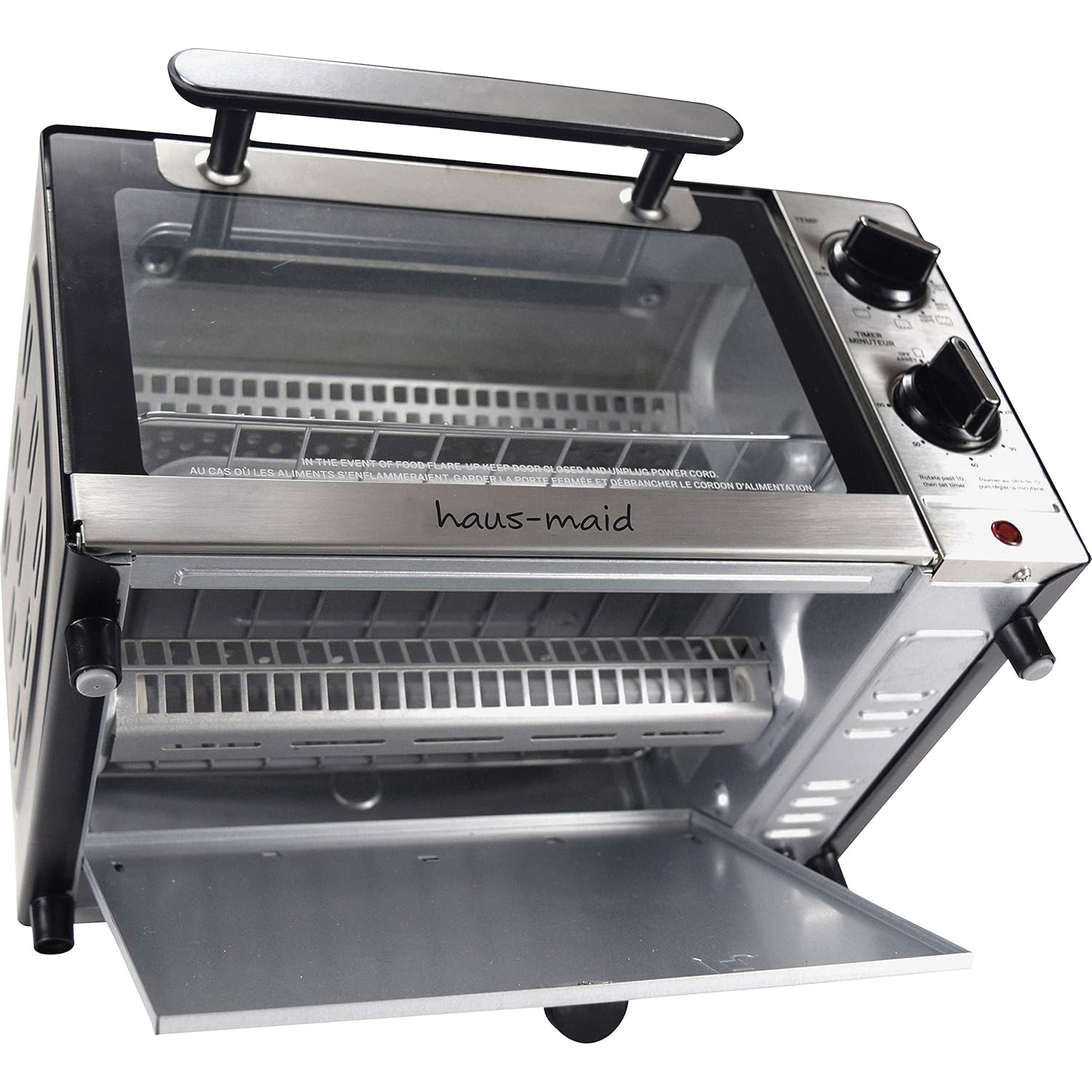 Versatile toaster oven offers a wide temperate range to let you easily toast, bake and broil foods. Easy-to-use dial controls including a 60-minute timer with light indicator ensure precise cooking results. Stainless steel body and shell of this Haus-Maid Toaster Oven provide a durable construction and professional look. Compact size is great for breakrooms and tight spaces. ETL Certified toaster oven also features a chrome slide-out rack, aluminum baking pan to ensure a perfect fit, crumb tray for easier cleaning, and two-prong, 2-1/2′ cord.