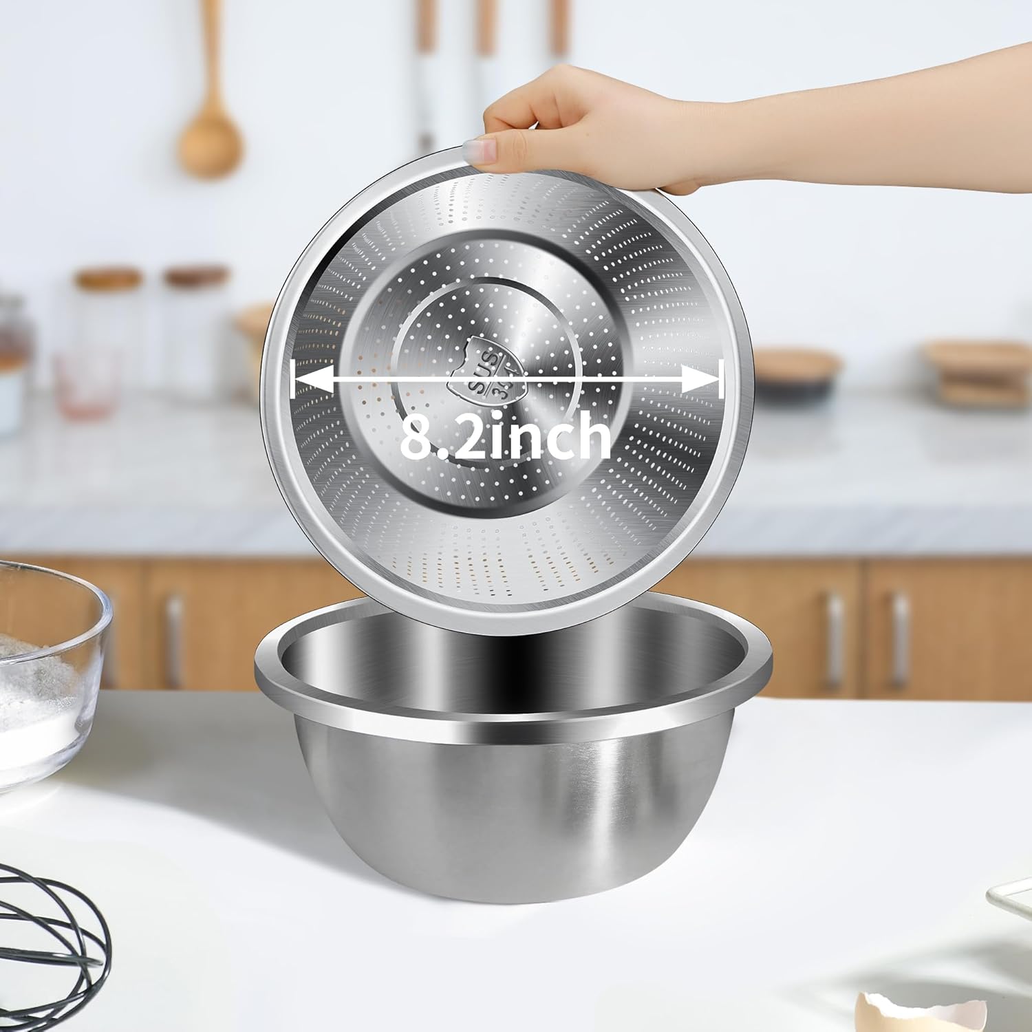 【4 Quart Bowl Strainer Set】 When we use a colander, there always seems to be water left at the bottom or leaking onto the countertop, simply nest the colander in a matching mixing bowl so that you can collect the leftover water and keep your tabletop tidy at all times. Alternatively, the mixing bowl can be used on its own to mix eggs, dough, and salads.