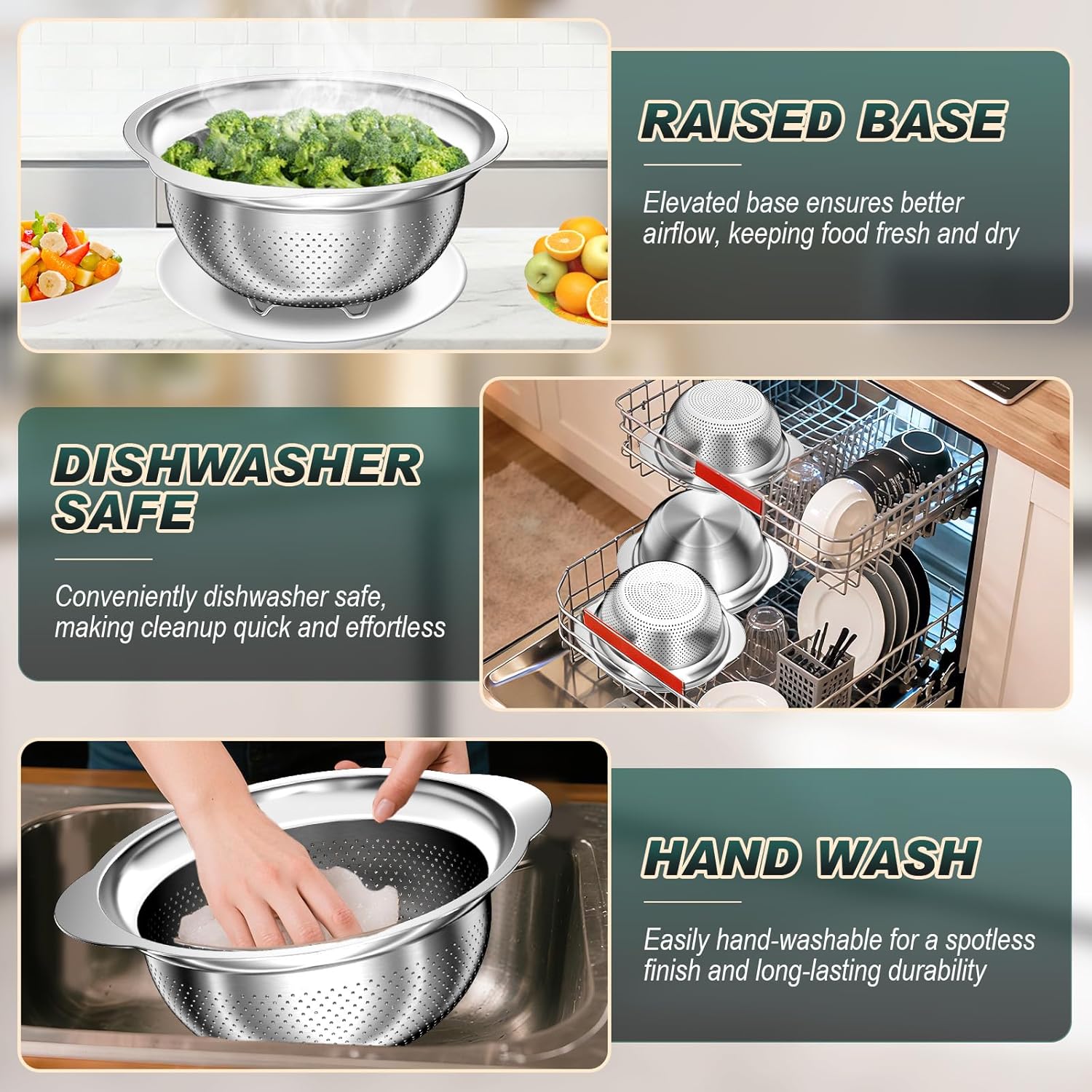 Premium Food-Grade Stainless Steel: Built for Modern Kitchens, Our colanders are made from food-grade stainless steel. This 3-piece colander set delivers long-lasting strength for daily use. The thickened construction resists rust and wear, while its modern look complements contemporary kitchen décor. An ideal upgrade from thin, lightweight strainers.