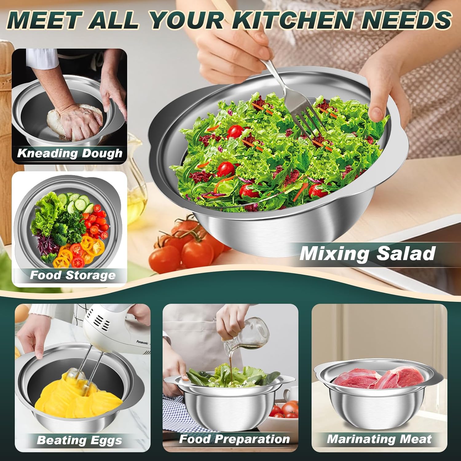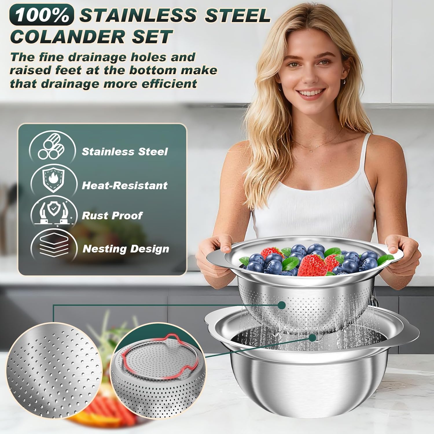 Non-Slip Wider Handles: The stainless steel colander set with wide, non-slip handles gives you a secure grip, even when handling hot or heavy food. The flared rim design adds stability and reduces splashes while pouring or shaking. Compared with flat-edge colanders, this design enhances safety, keeps countertops cleaner, and performs reliably during family meals or outdoor gatherings.