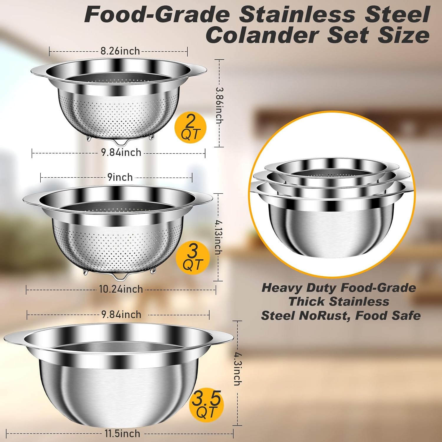 【Easy to Clean & Space-Saving 】This multi-purpose colander set (3QT+2QT Colander + 3.5QT Mixing bowl) is perfect for rinsing, draining, straining, and more—all in one. Easy to clean by hand or dishwasher-safe. The nesting design saves space in your kitchen cabinets. Nesting colander stainless steel set is a practical and thoughtful gift for housewarmings, Christmas, New Year, weddings, Halloween, or birthdays.