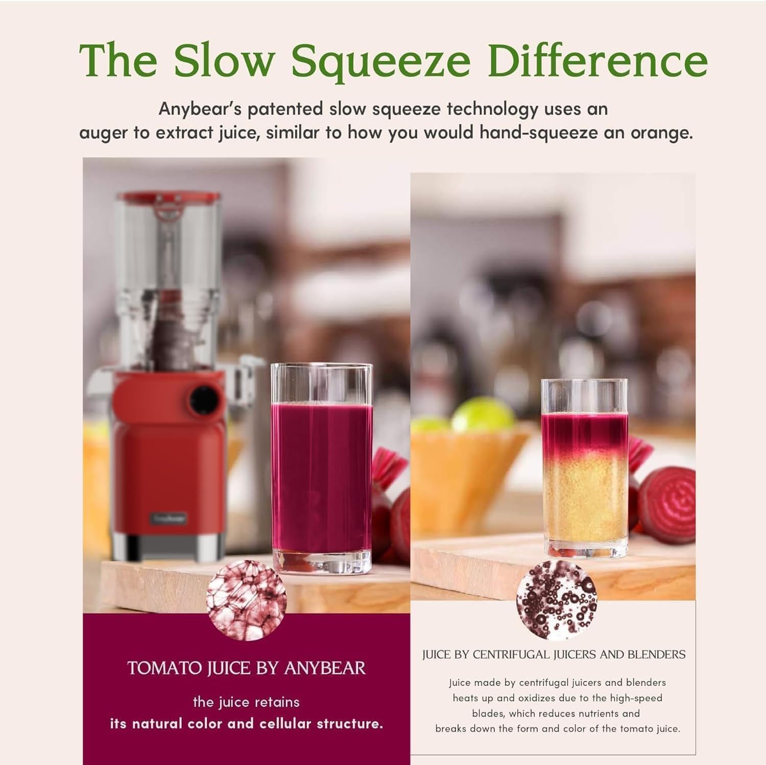 【180nm HIGH-TORQUE, 200W Powerful Motor】Anybear masticating juicer machine with a high torque of 180nm, ensuring the rotating speed up to 65 RPM, paired with a powerful 200W motor, effortlessly extract juice at low speeds to enhance juice yield up to 98.9%. Minimize oxidation for doubled flavor and freshness.