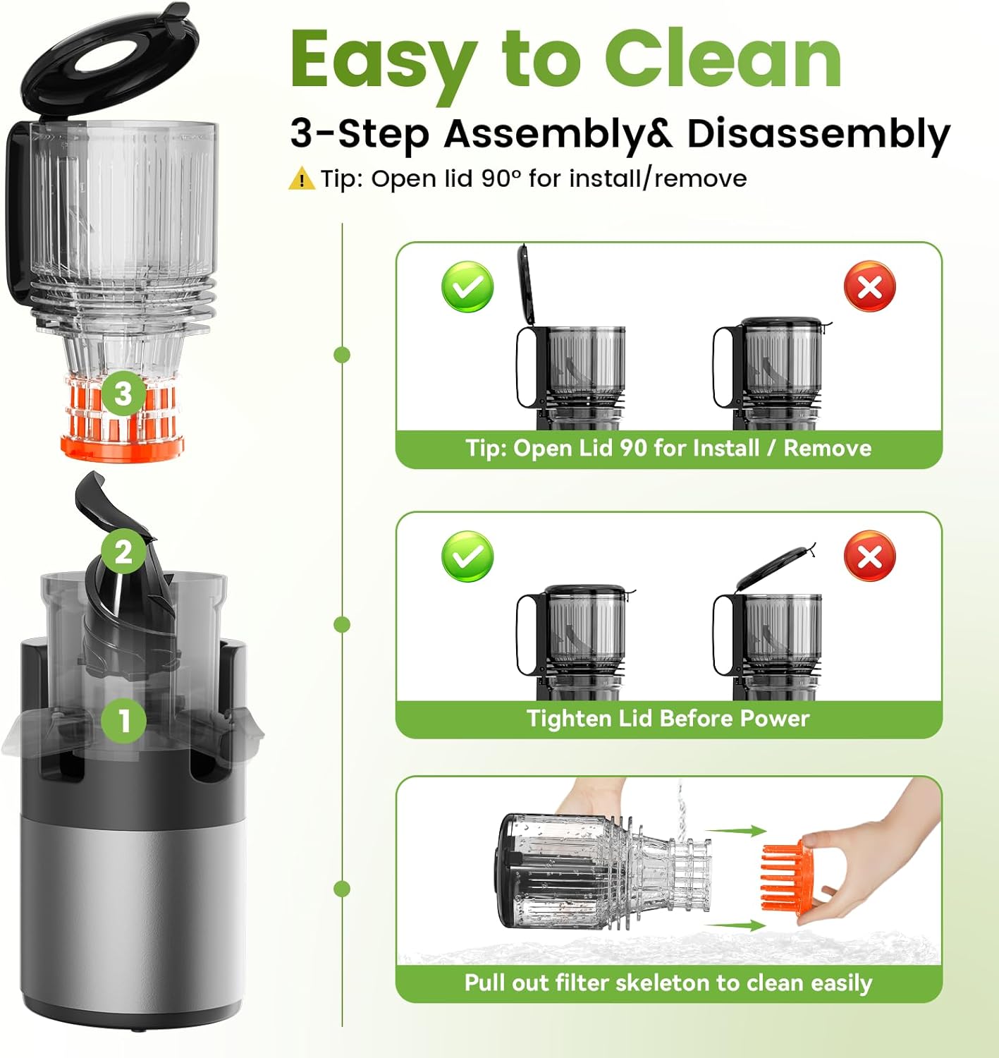 Juicer Easy to Clean: This fruit juicer machine is detachable design, paired with a Cleaning Brush and a User Guide Video demos, speeds cleaning by 50%.Reverse function to unclog, easy pressed juice, stops when lid open. An ideal juice extractor machine for families, from kids to seniors