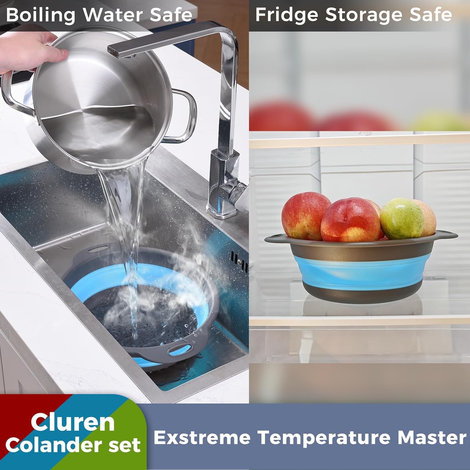 🚰 【Space-Saving & Multifunctional Design】Fold colanders flat to 3-3.5cm thick for easy storage in drawers or cabinets; when collapsed, they double as serving plates, and expand to function as efficient strainers. The extra-large base adds versatility—use it with your existing kitchen tools, reducing the need for multiple accessories.