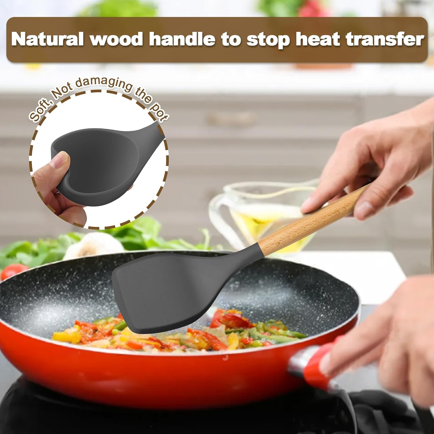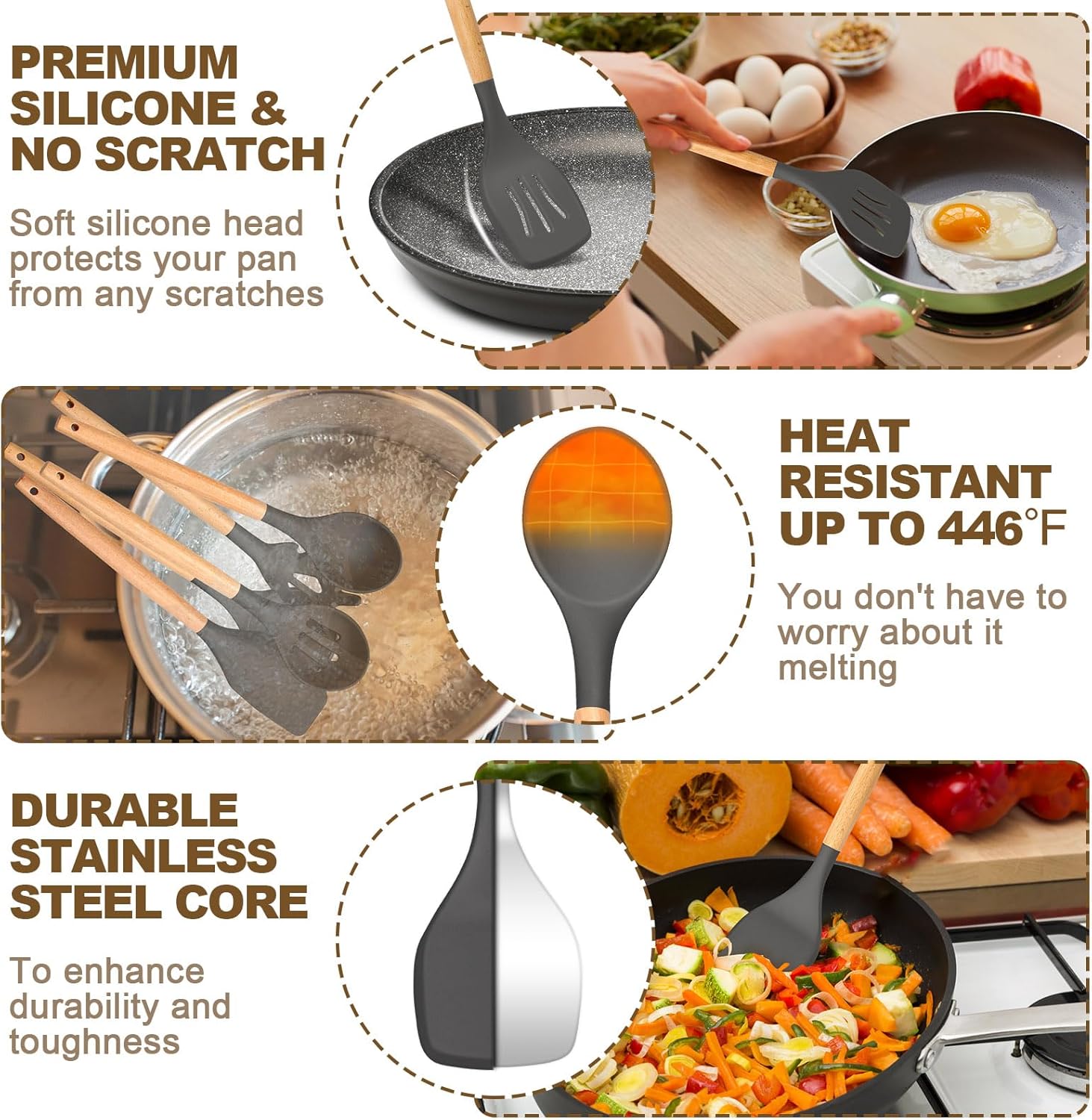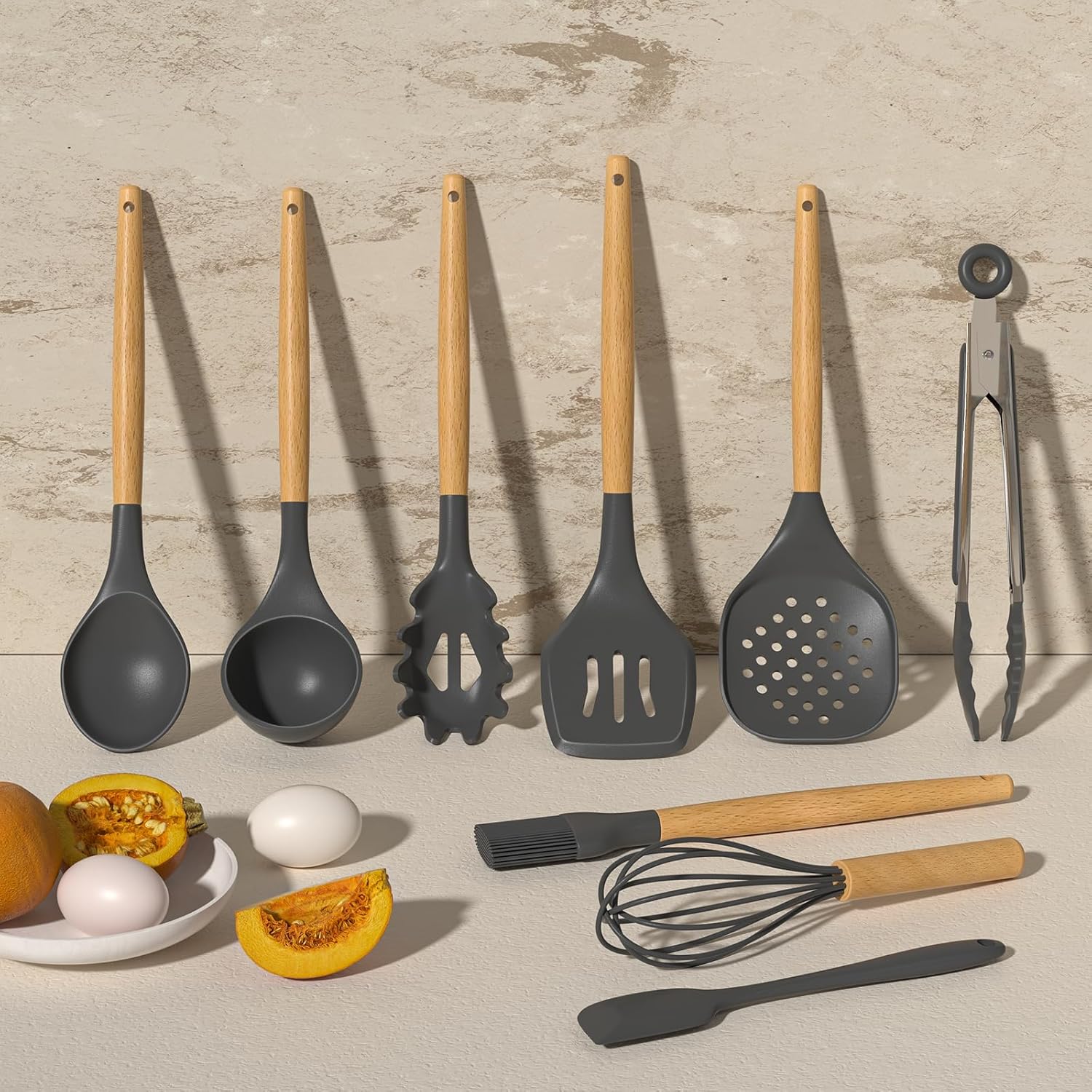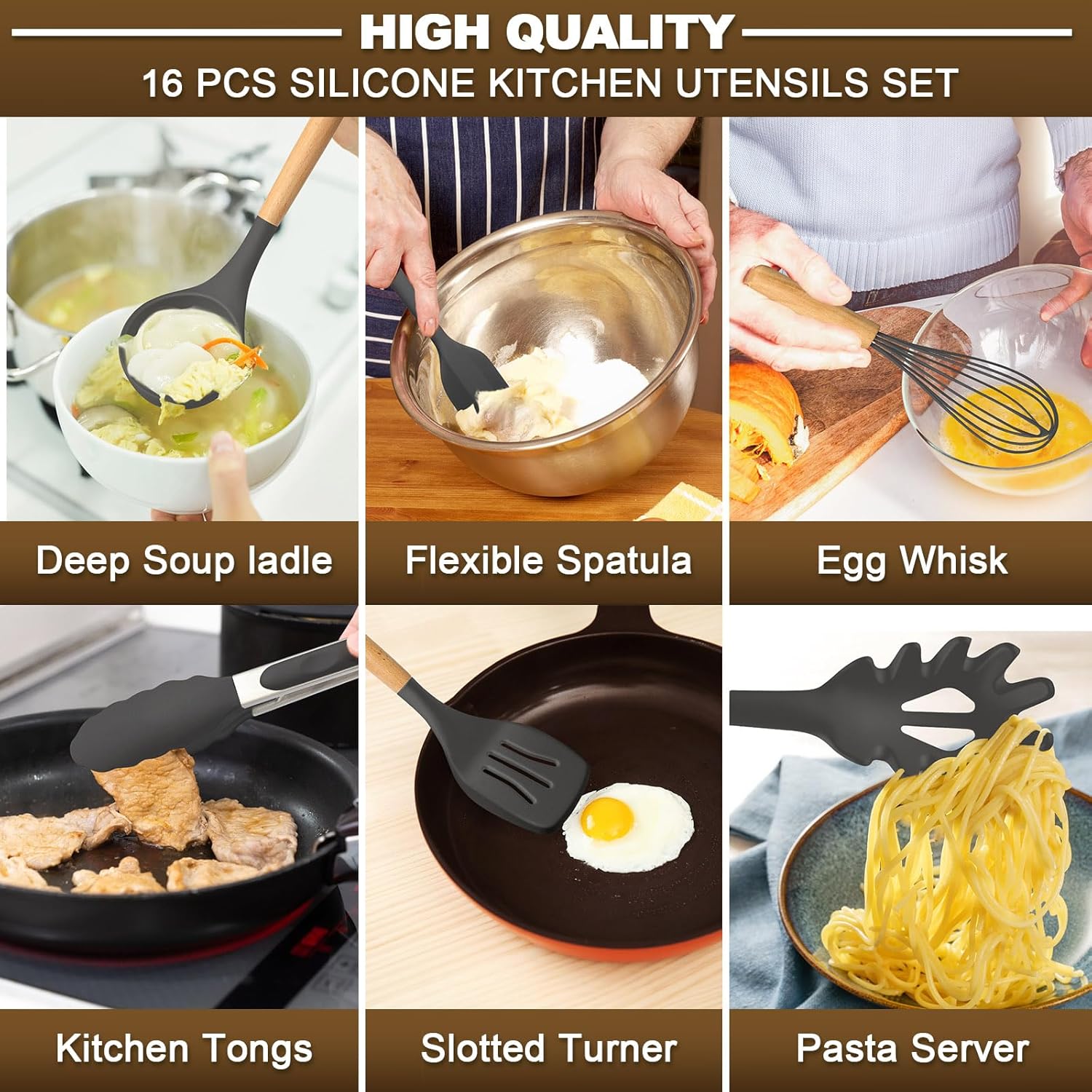 Cooking Kitchen Utensils Set, AIKKIL 16 Pcs Silicone Cooking Utensils Set with Holder, Heat Resistance, Wooden Handle Grey Kitchen Gadgets Utensil Set for Nonstick Cookware