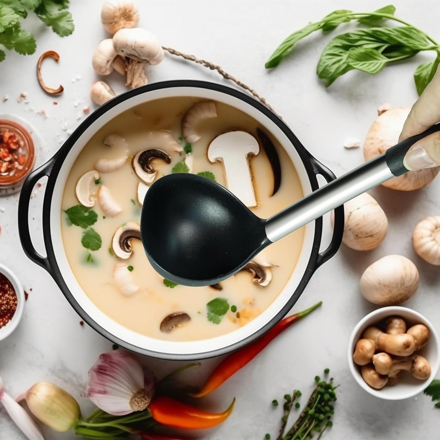 🎁【MULTIFUNCTIONAL ALL-IN-ONE】 – This comprehensive 6-piece set includes a slotted turner, solid turner, slotted spoon, solid spoon, soup ladle, and spatula, perfect for a variety of cooking tasks. The flexible edges of the silicone turner make flipping and mobilizing a breeze, while the slotted spoon is designed to efficiently drain liquids. The spatula is perfect for stirring salads, while the ladle makes serving soup a breeze, ensuring this set has all your kitchen needs.
