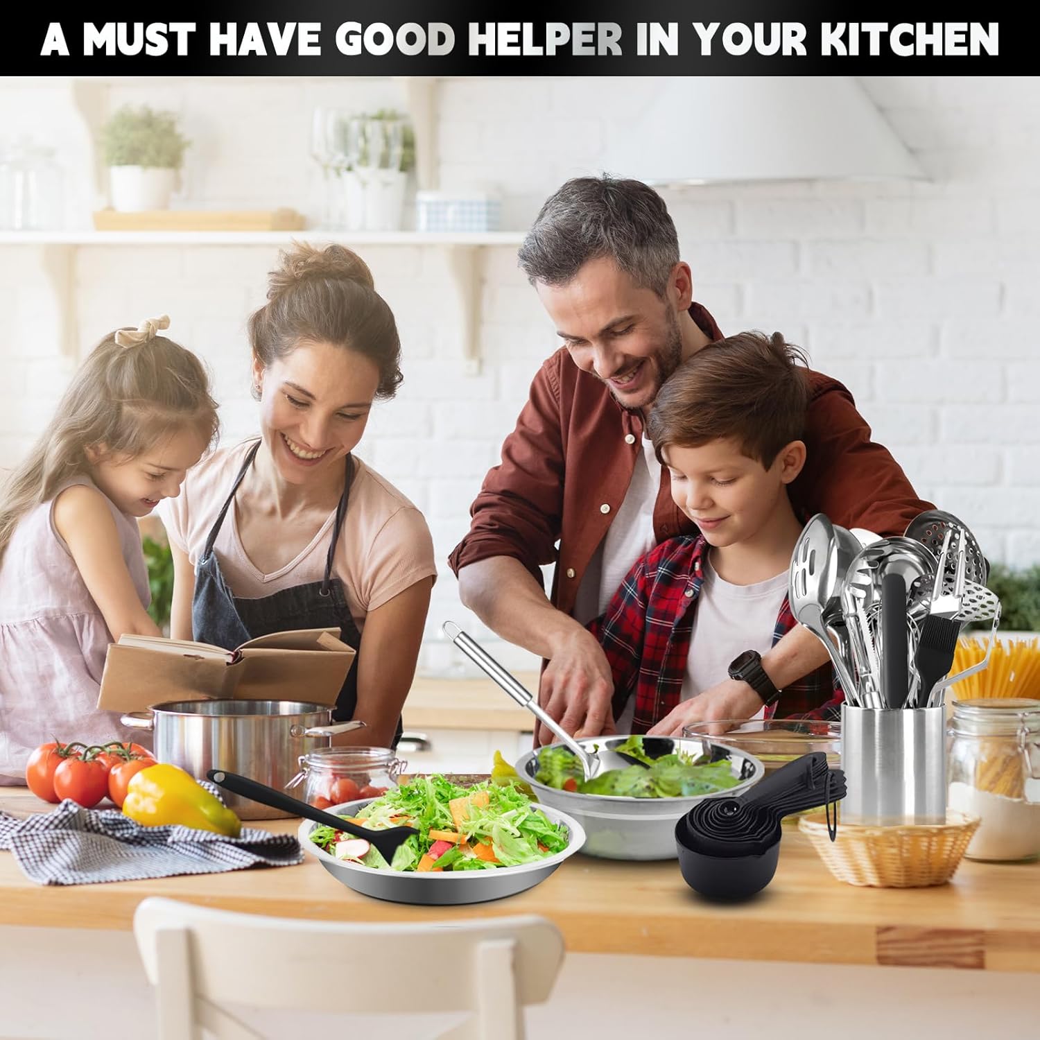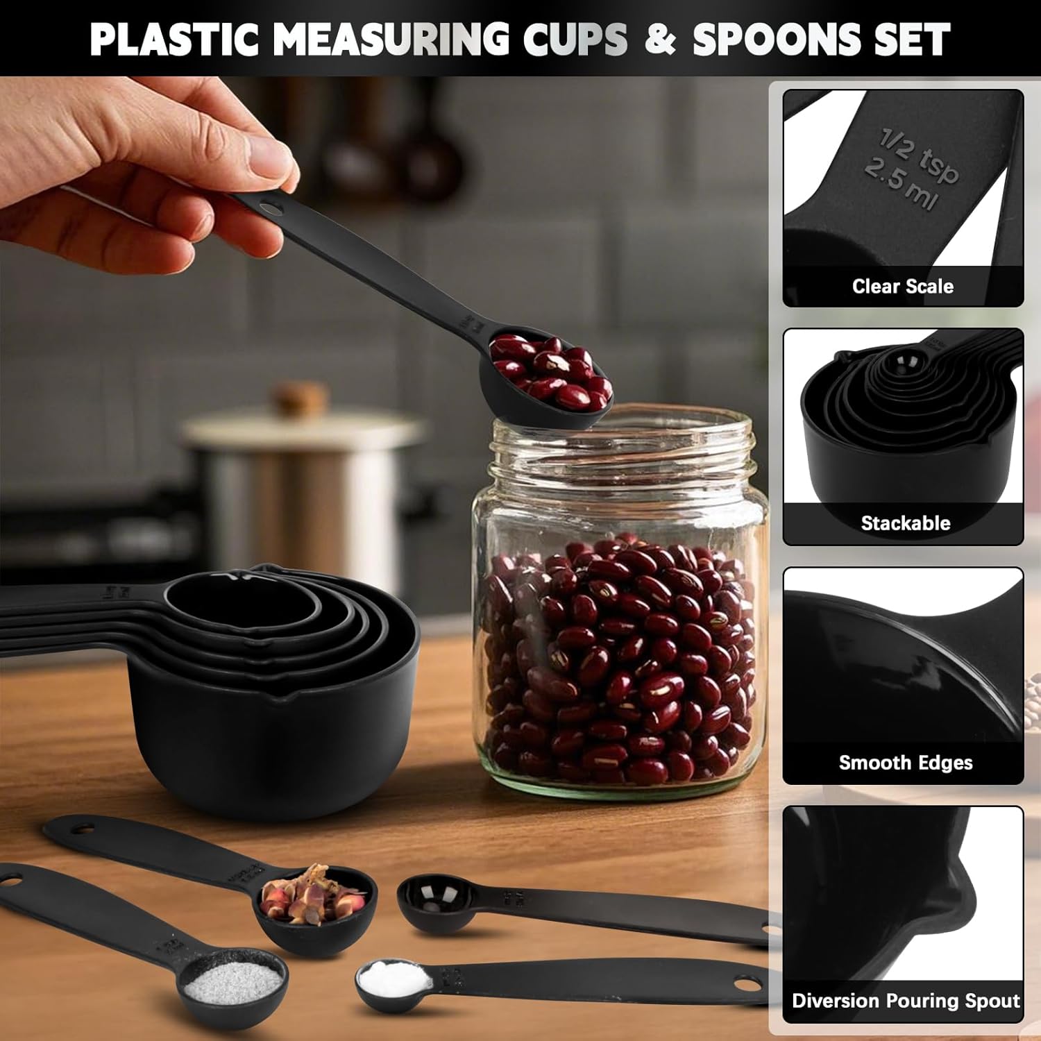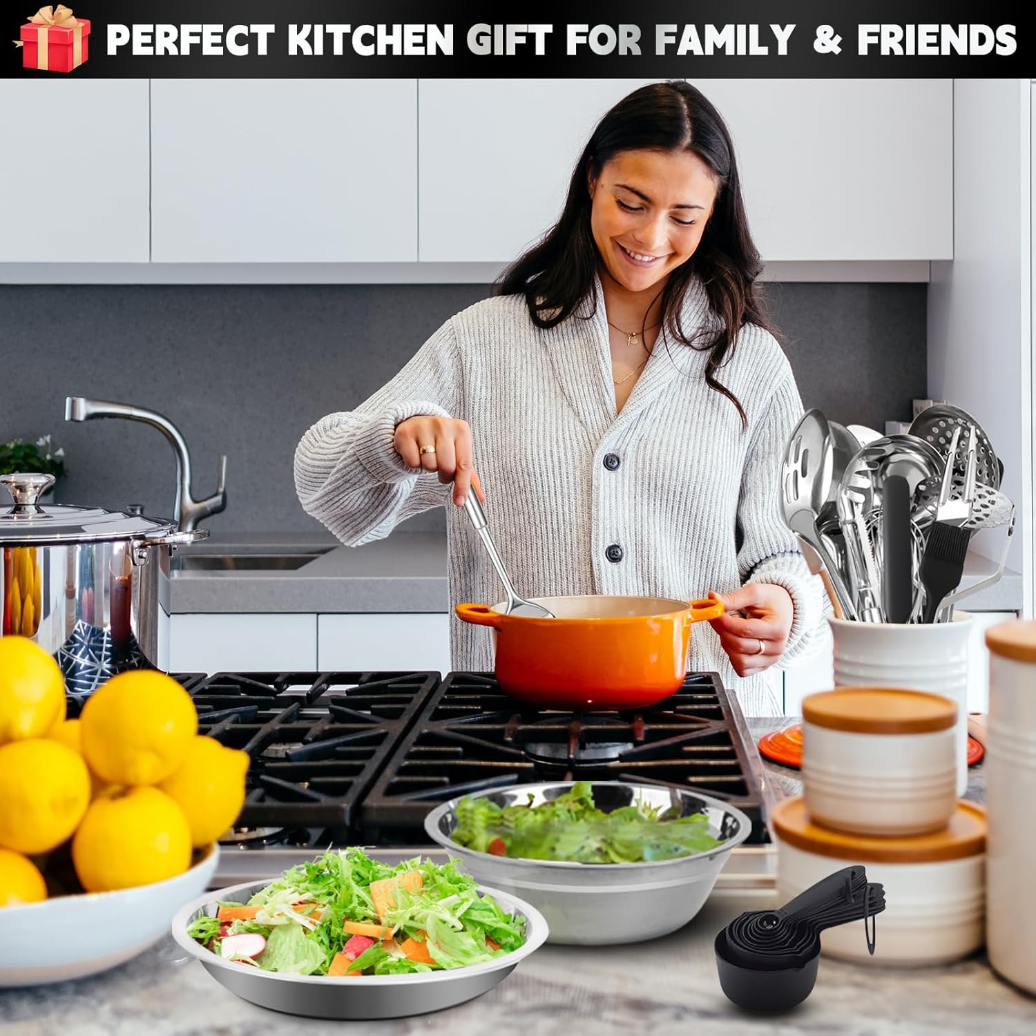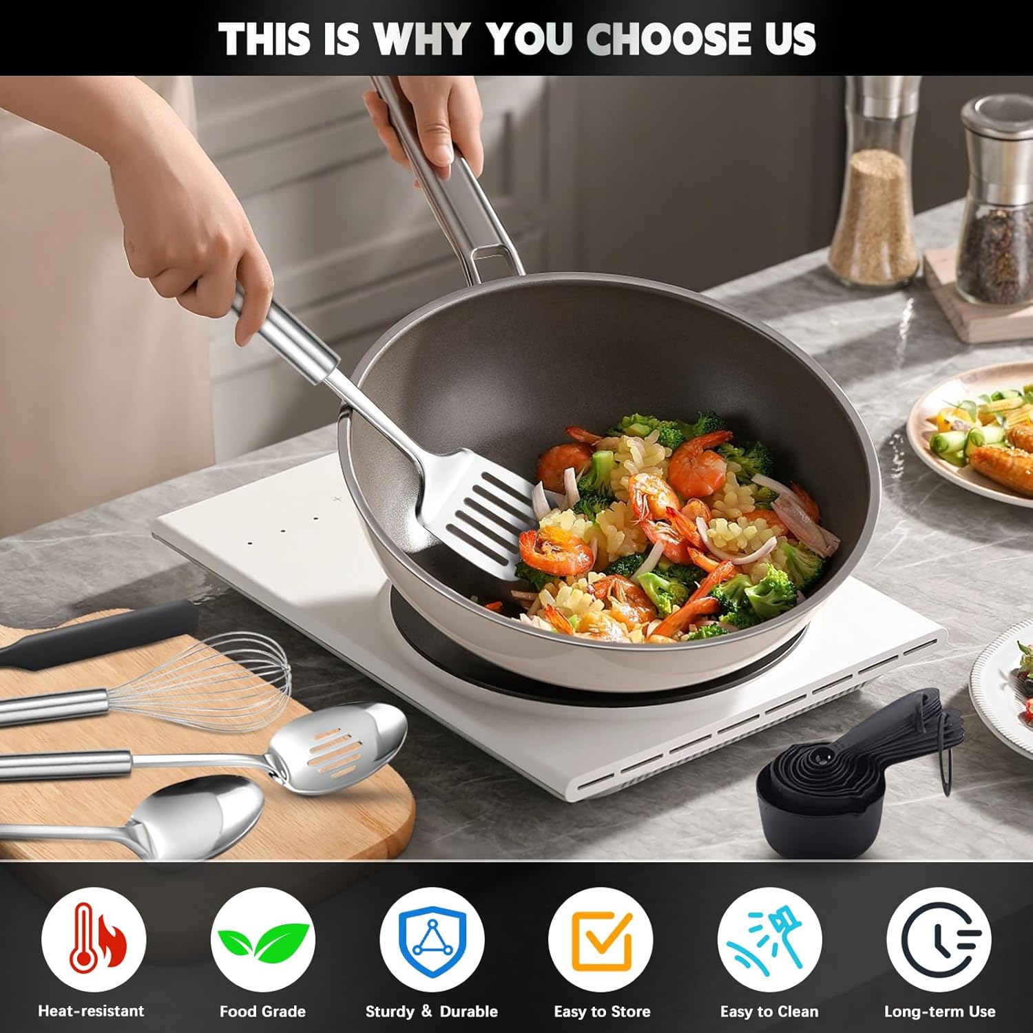 【HEAT-RESISTANT & EASY TO CLEAN】 This stainless steel cooking utensil set has excellent heat resistance, ensuring that it will not deform or release harmful substances during high-temperature cooking, making it safer to use. The clear design of the numbers on the plastic measuring cups and spoons ensures that they can be easily read while cooking, and stackable design can also greatly save space. These cooking utensils have a smooth surface, just rinse with clean water to save cleaning time.