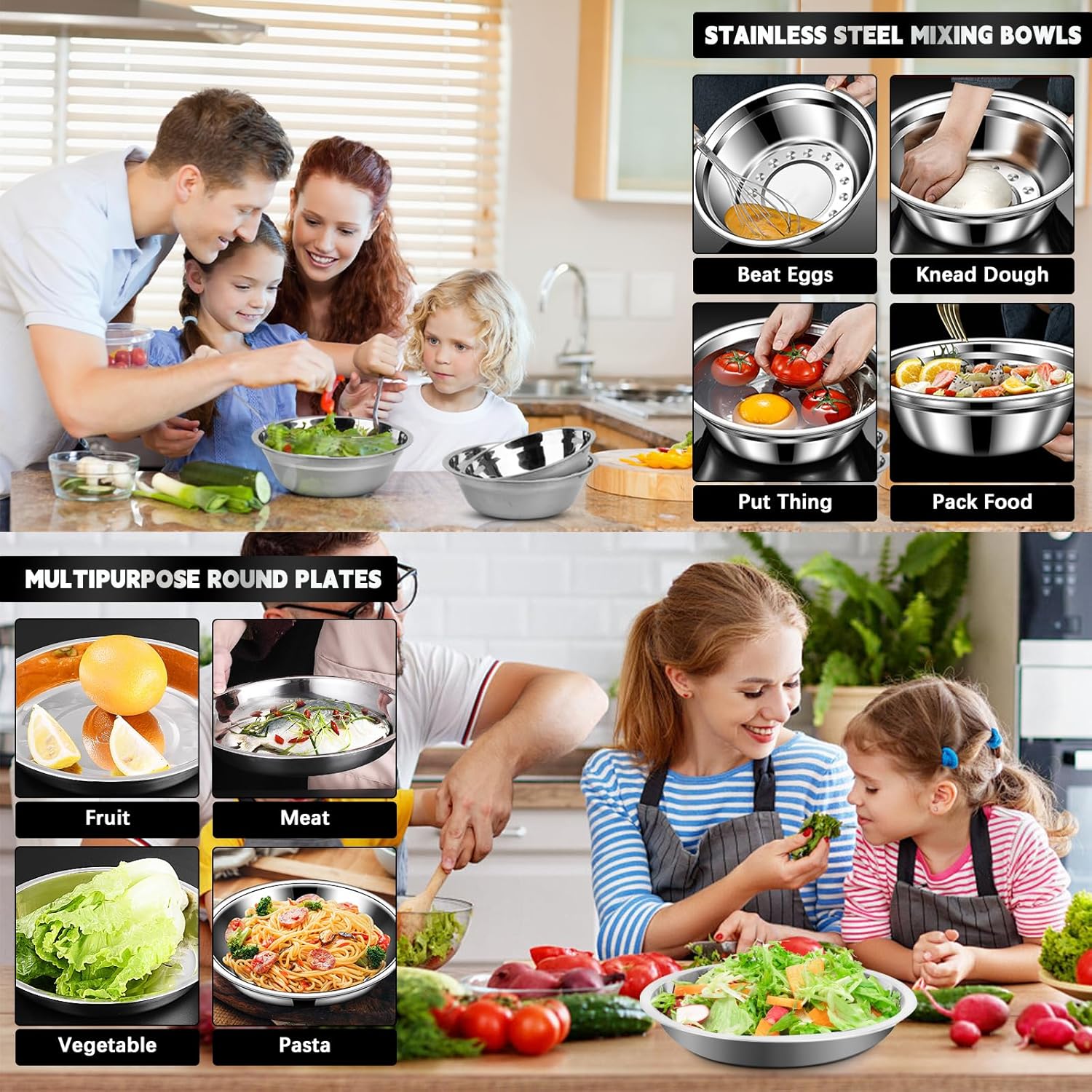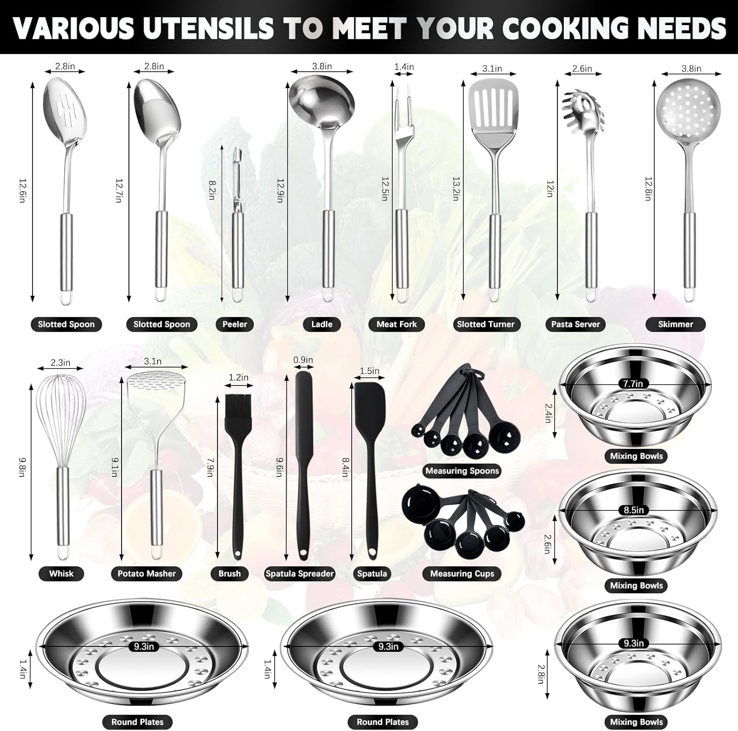 【ALL-IN-ONE KITCHEN TOOL SET】 This is an all-round kitchen utensil set that meets all the tools needed for cooking. The set includes 1 solid spoon, 1 draining spoon, 1 peeler, 1 deep soup ladle, 1 meat fork, 1 spatula turner, 1 serving spoons pasta server, 1 slotted spoon, 1 egg whisk, 1 potato masher, 1 silicone brush, 1 silicone jar spatula, 1 silicone scraper, 10 pcs plastic measuring cups and spoons set, as well as 3 stainless steel mixing bowls of different sizes and 2 round plates.