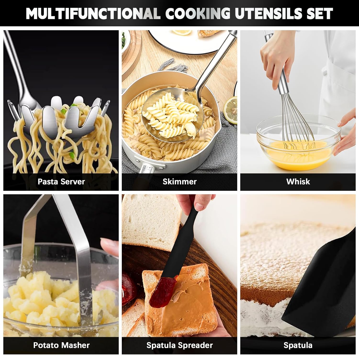 【FOOD GRADE MATERIALS】 Our cooking utensils set is made of premium food grade materials to ensure safety and health. All parts that come into direct contact with food have been strictly tested and do not contain BPA and other, so you can use them with confidence to prepare meals. The kitchen utensils set are not only non-toxic and odorless, but also effectively resist the adhesion of grease and food residues, keeping the surface of the cookware clean.