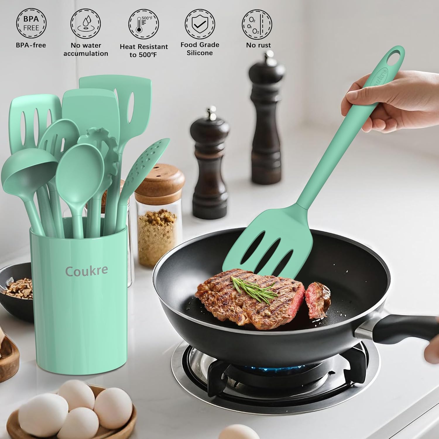 [Sturdy & Flexible Construction]: Coukre silicone kitchen utensils are reinforced with a sturdy plastic core, offering exceptional durability and stability. The core prevents bending or deformation, and the soft silicone coating provides flexibility while protecting your cookware from scratches.