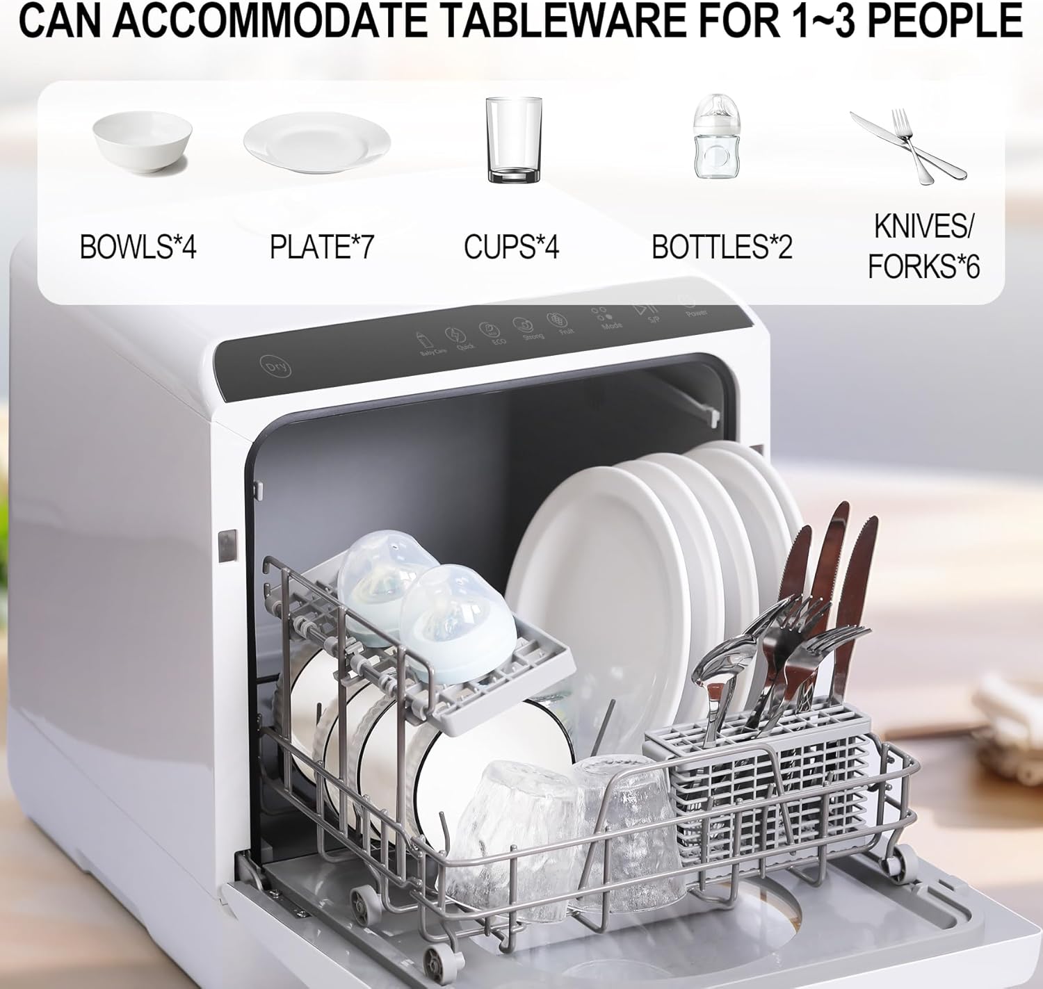 [FIVE PROGRAMS] Our portable dishwashers countertop offers five programs: Normal, Quick, Eco, Baby Care, Fruit. The Quick mode can complete cleaning in 29 minutes. The interior is equipped with upper and lower spray arms, which can deep clean dishes and cutlery, as well as baby bottles at 360°.