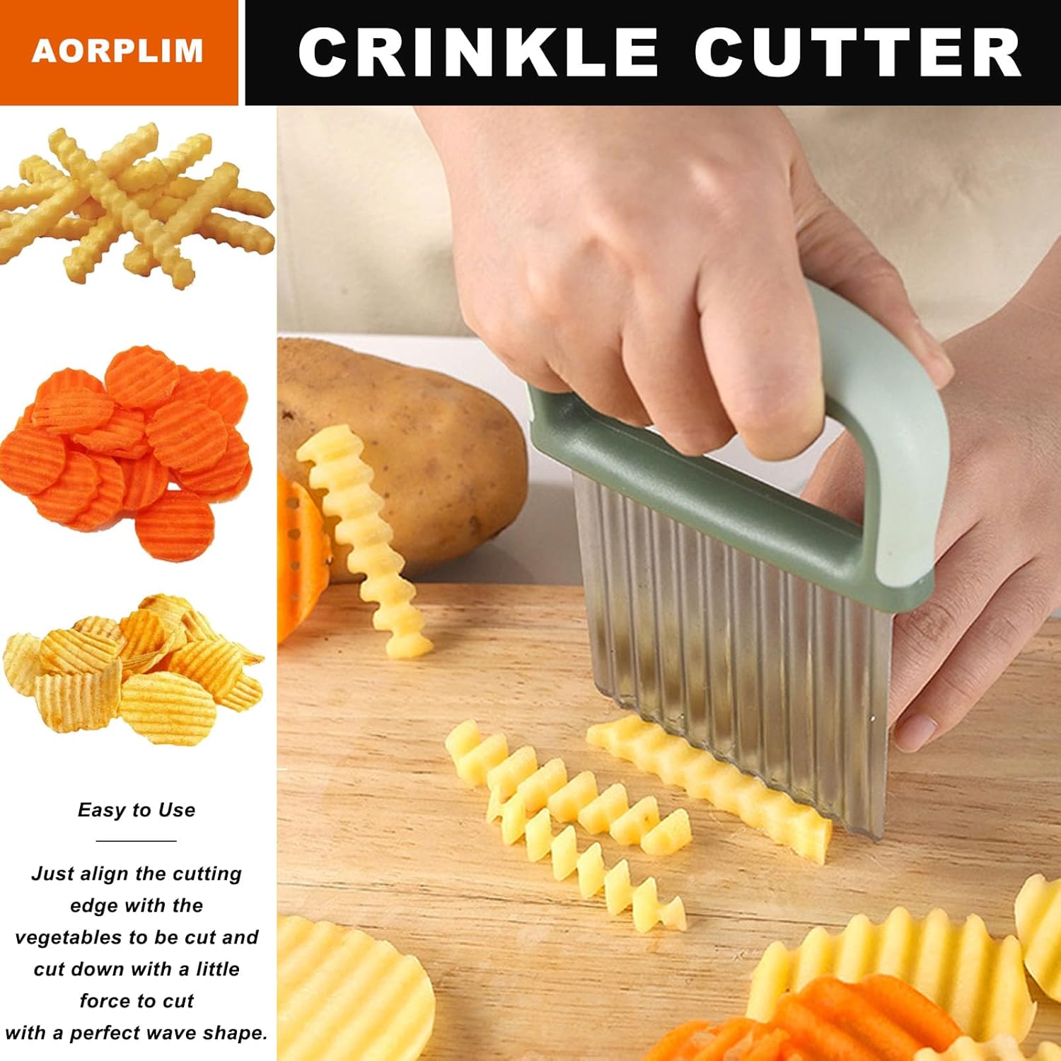 Makes Two Shapes Of Fries: WAVE AND REGULAR; Crinkle-Cut Wave Slicer cuts wavy-cut or waffle fries, and pickle chips, creates decorative garnishes, chops egg and tuna salad, and more; Regular potato cutter allows you to quickly and accurately cut the required amount of french fries and vegetables for stews in the form of bars or cubes.
