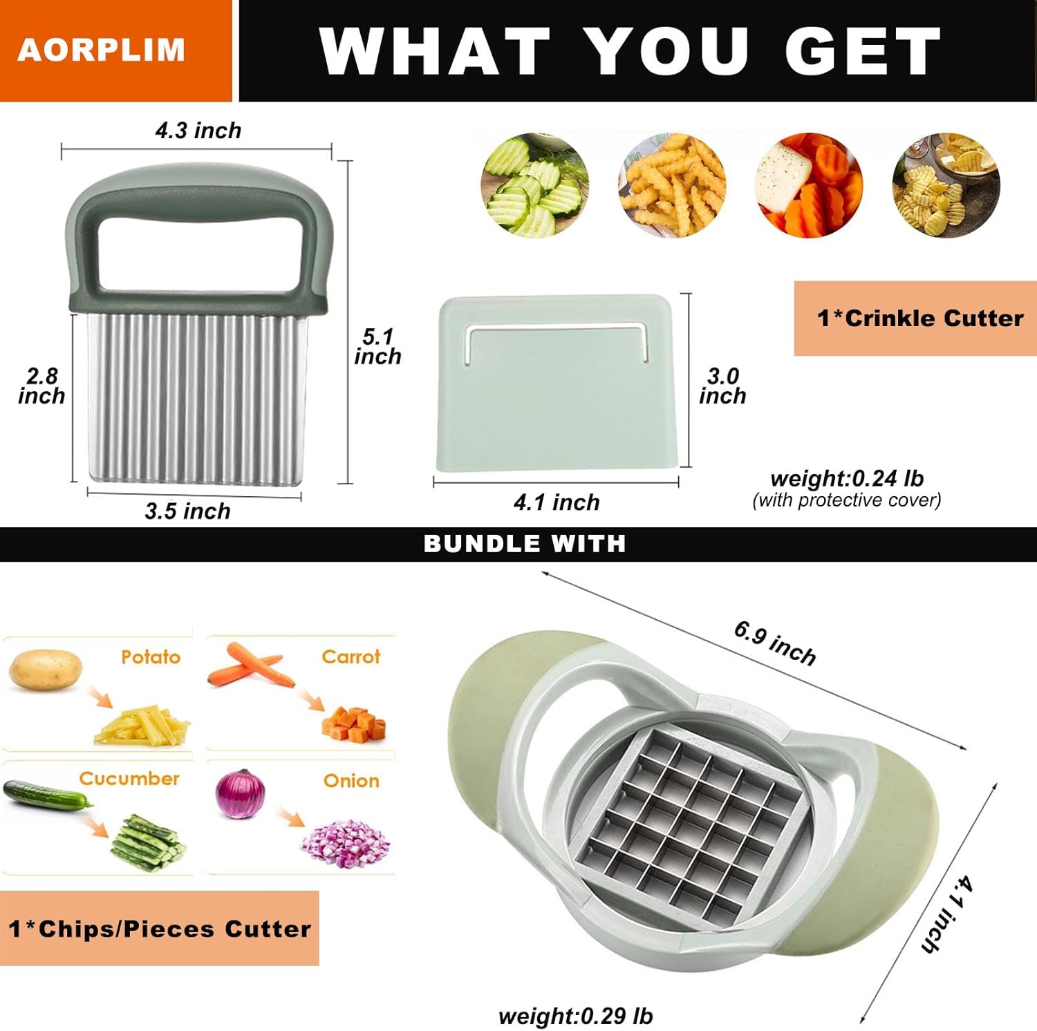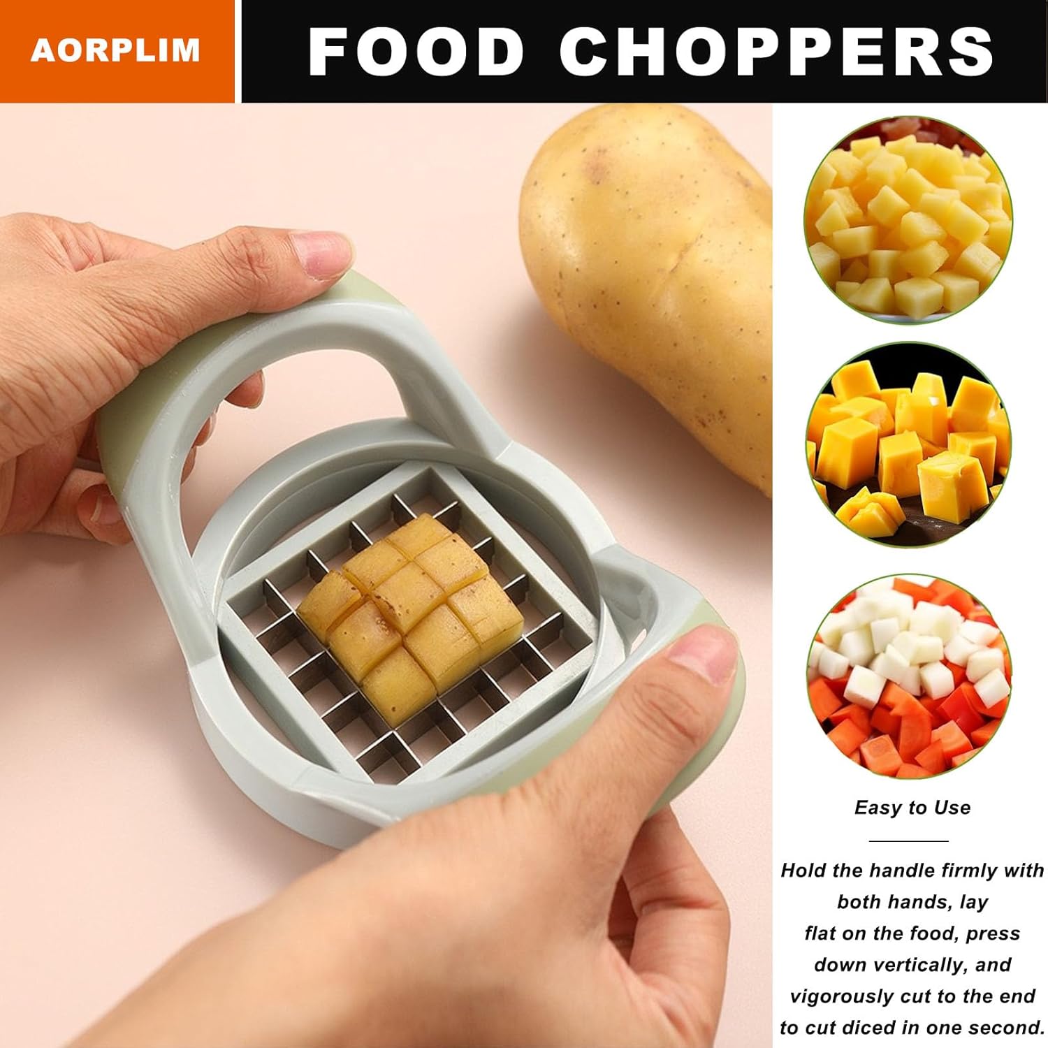 Easy To Use – Position the blade over food and press firmly downward or use an up-and-down motion to chop food. Our cutter effortlessly slices potatoes, carrots, and other vegetables into different shapes fries, and chips with just one simple motion.