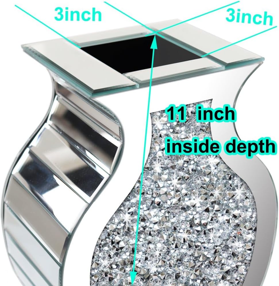 Mirror Vase out size 8 inch wide x 4.7 inch thickness x 15 inch tall. Inside cut out for flowers size is 6.5 inches deeps, 1.6×2.5inch width. Material: lots of mirror pieces outside on surface, loads of sparkly diamond crush crystal on the front and back, inside MDF construction. Elegance and luxury decorative vase for any room. Fantastic Looking.