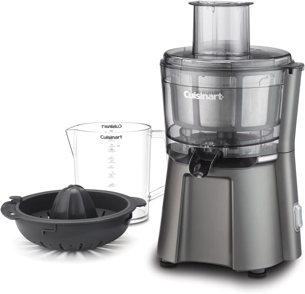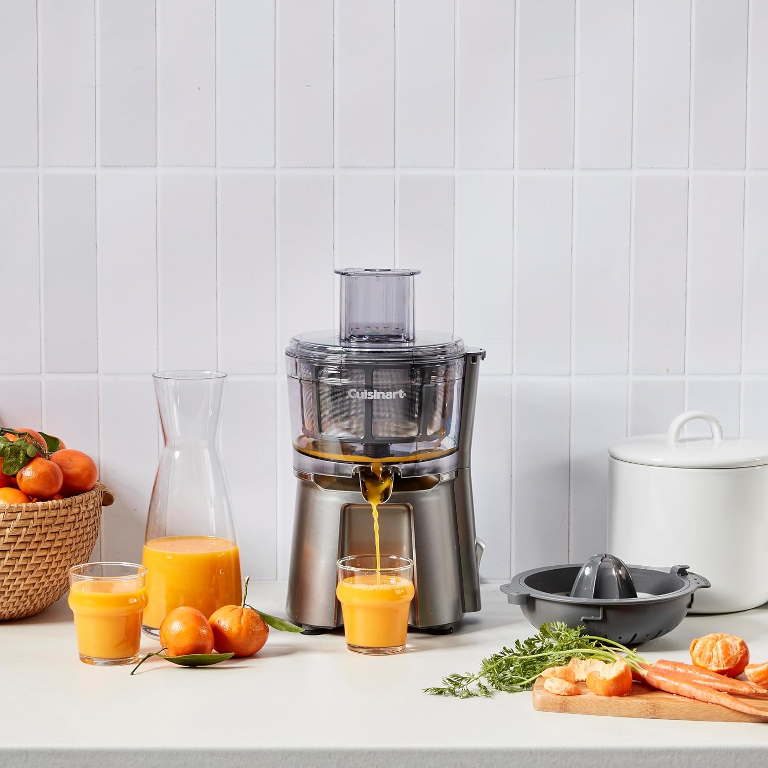 Turn any countertop into a juice bar with the space-saving 2-in-1 Juice Extractor and Citrus Juicer by Cuisinart®. Interchangeable attachments, constructed with durable plastic and stainless steel, lock onto the slip-proof base and maximize juice extraction with minimal mess. Custom-designed for rapid juicing, the Extractor turns fruits and vegetables into nutritious juice blends with a grinding disk, 220-watts of centrifugal force, and micro-mesh basket that finely filters out pulp and peels. Change to the high-powered, push-activated Citrus Juicer to ream citrus right down to the rind. With automatic reverse, final spin, and 3 pulp preference settings, it’s easy to make perfect tart and tasty citrus-ades in countless flavor combinations.