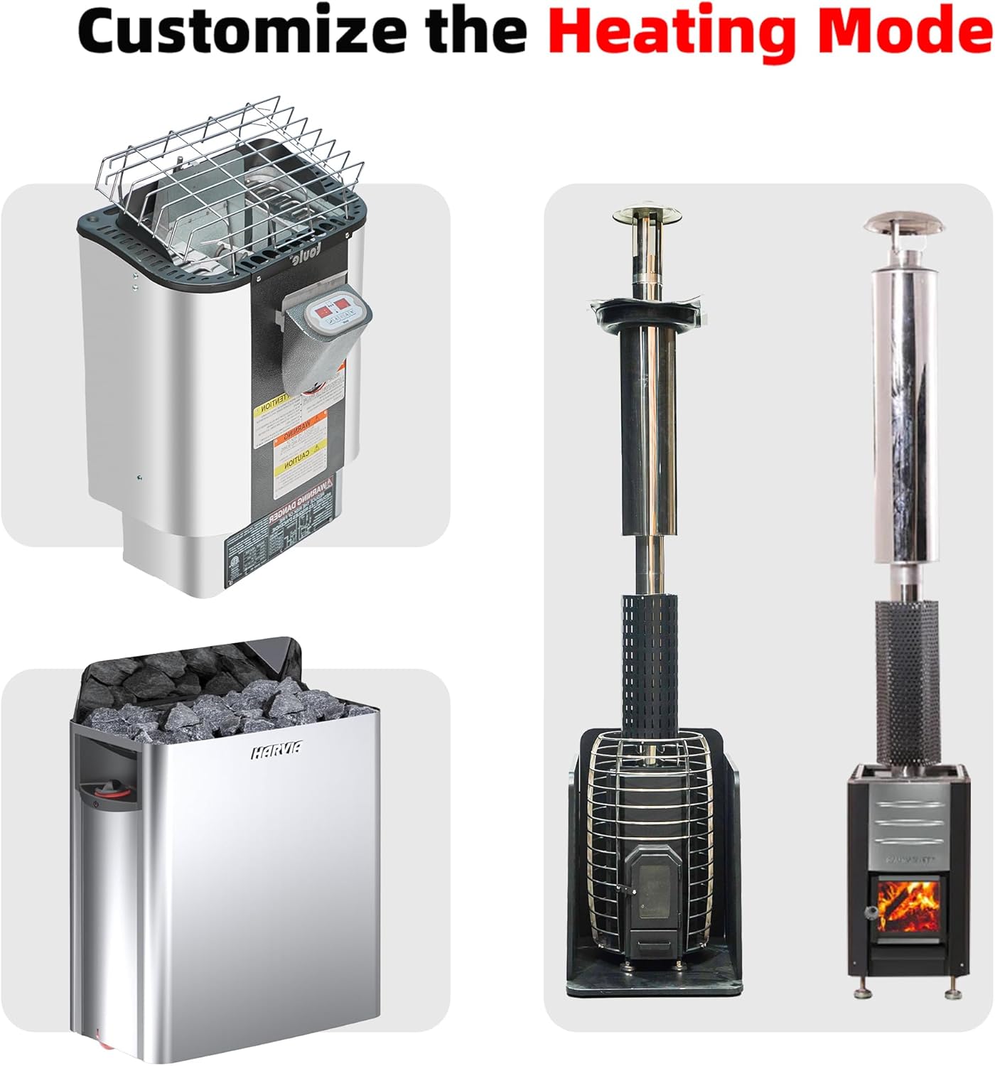 You can feel the primitive way of sauna by using the wood-burning stove. Note that due to the large size of the wood-burning stove, it is recommended that you customize the sauna to be longer than 70.86in if you want to choose a woodstove