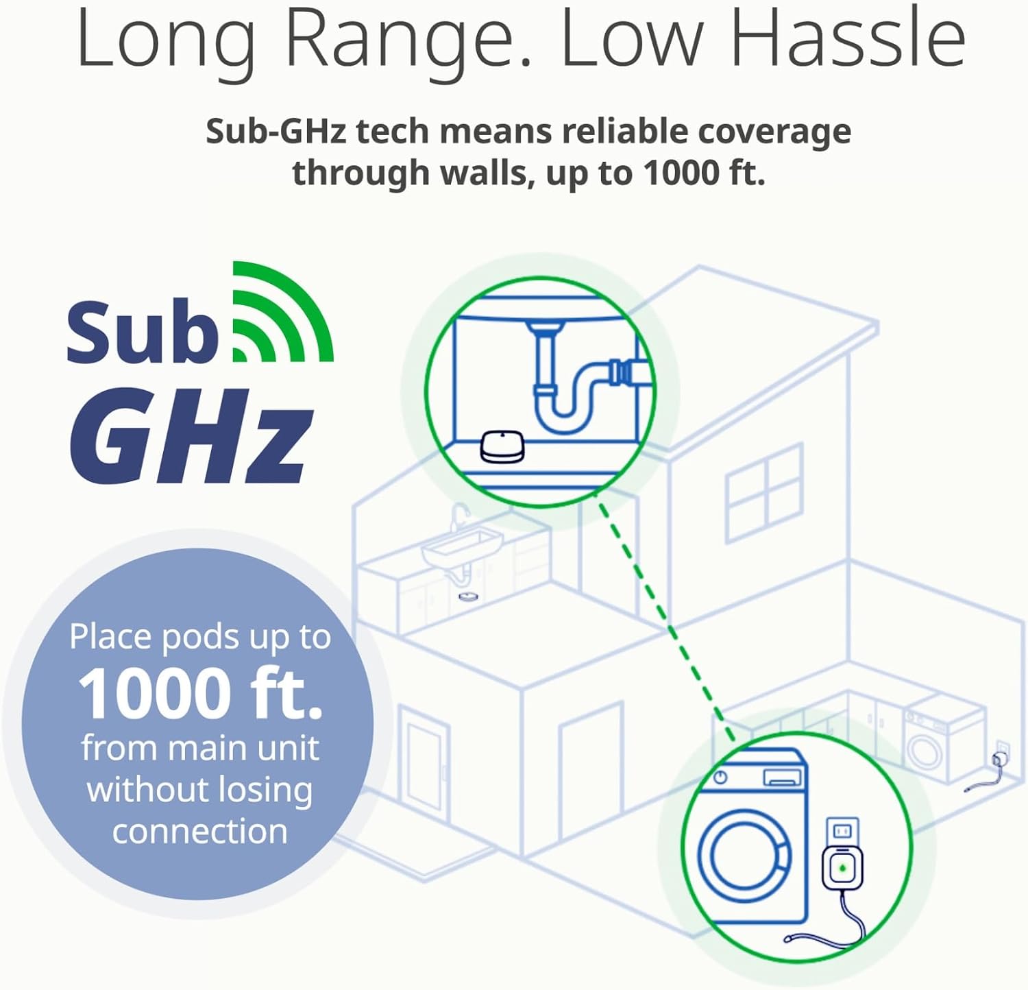 WHOLE HOME MONITORING – SW-A2 Pods can be controlled by a single Master Sensor Plug to expand water leak monitoring as your property needs grow. Uses an integrated long-range sub-GHz wireless connection to connect to the Master Plug-in Smart Wi-Fi Water Leak Sensor found in the SW-A11KT kit (up to 1000 ft). Battery life of up to 2 years with the 2x pre-installed AAA batteries