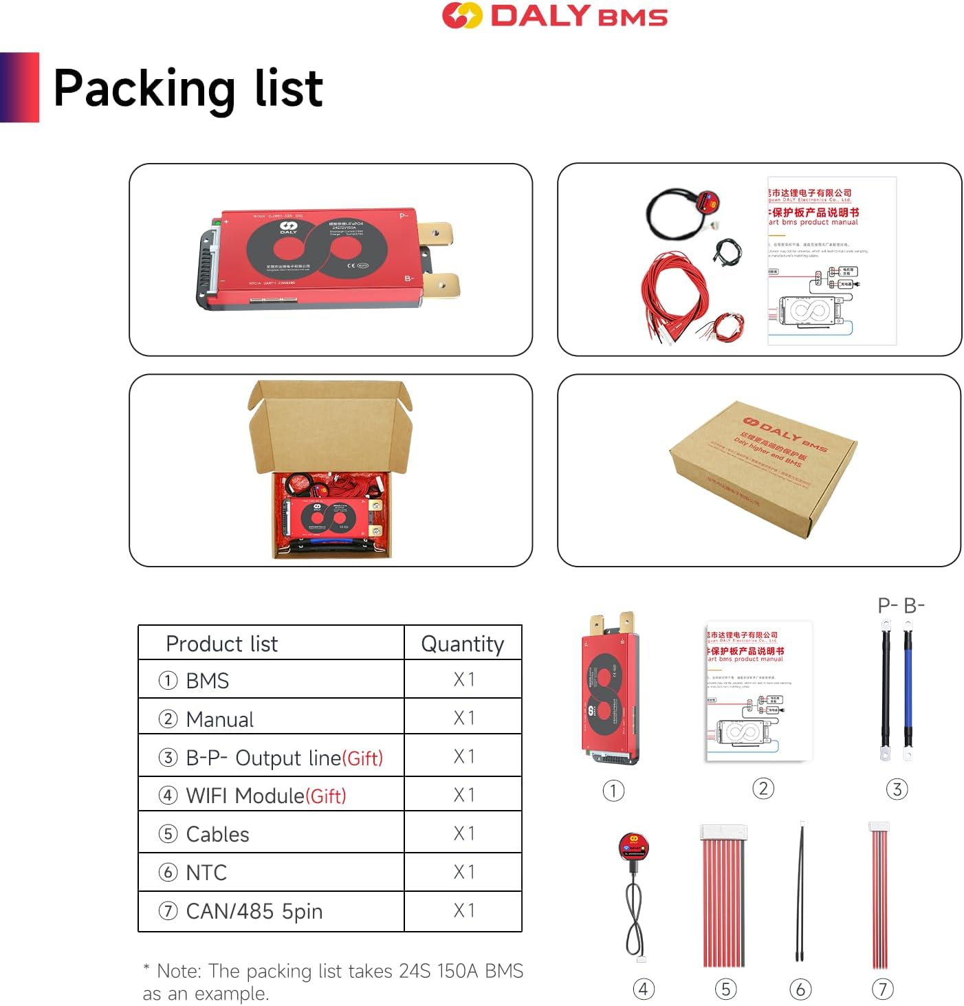 3 Years Warranty. Packing List: 8S 24V 150 amp Smart BMS (x1), B-P-Output Line (x1), 2-in-1 BT/Wi-Fi Dongle (x1), Sampling Cable (x1), NTC (x1), CAN/485 5-pin (x1), Manual (x1). Easy to install, everything you need for setup and operation.ISO/FCC/RoHS/PSE/CE APPROVED.