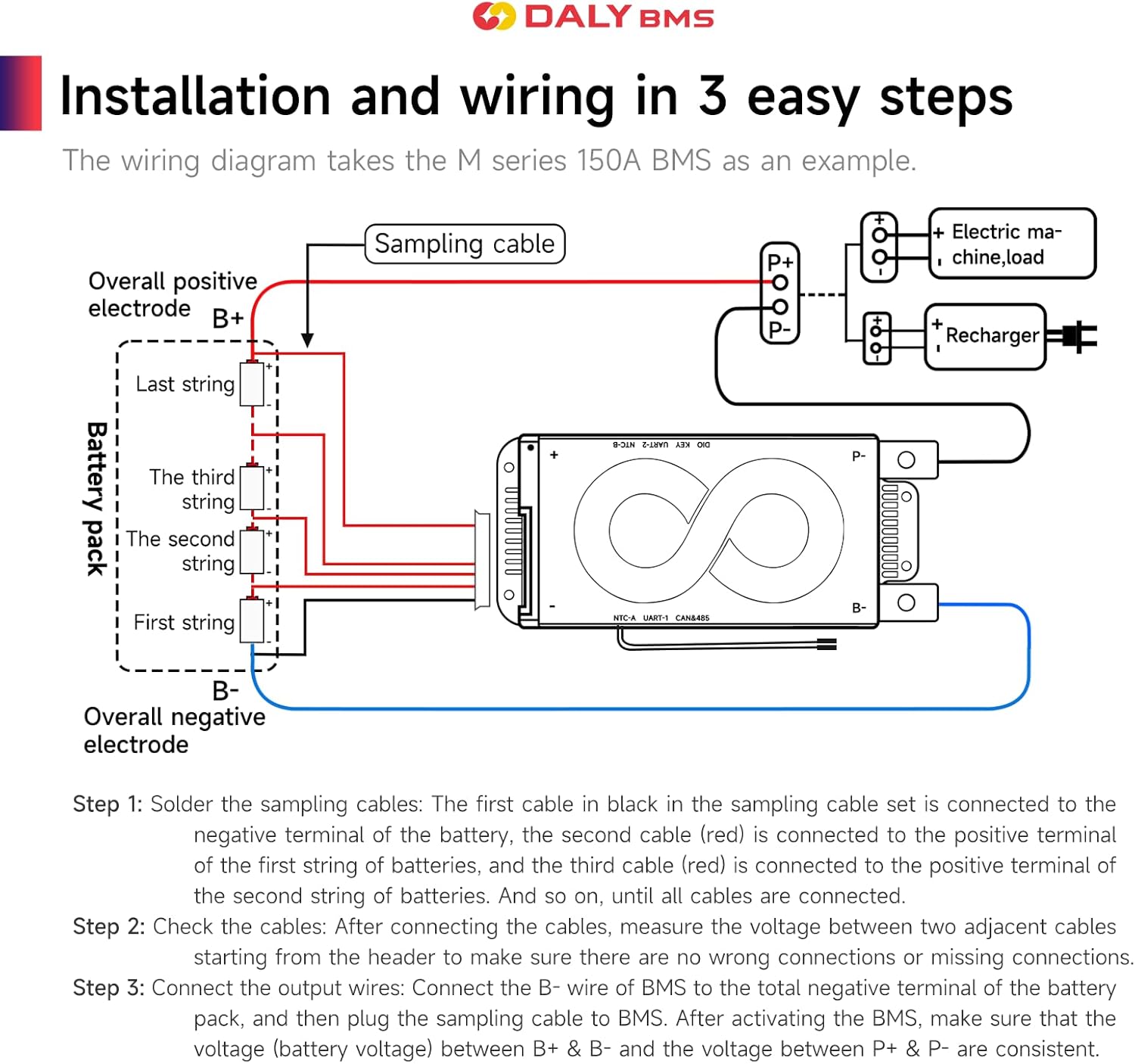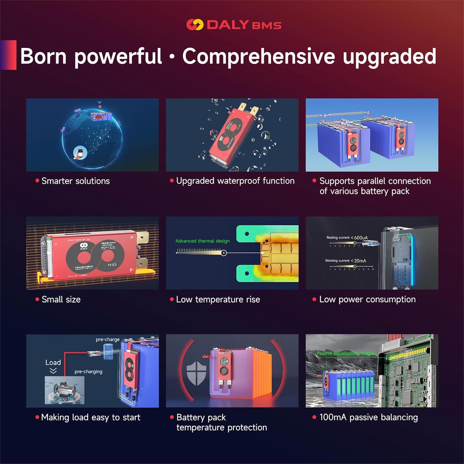 Enhanced Battery Safety: Daly 24V BMS 8S offers protection against overcharging, overdischarging, overcurrent, short circuits and extreme temperature, ensuring the safety and longevity of your battery pack.
