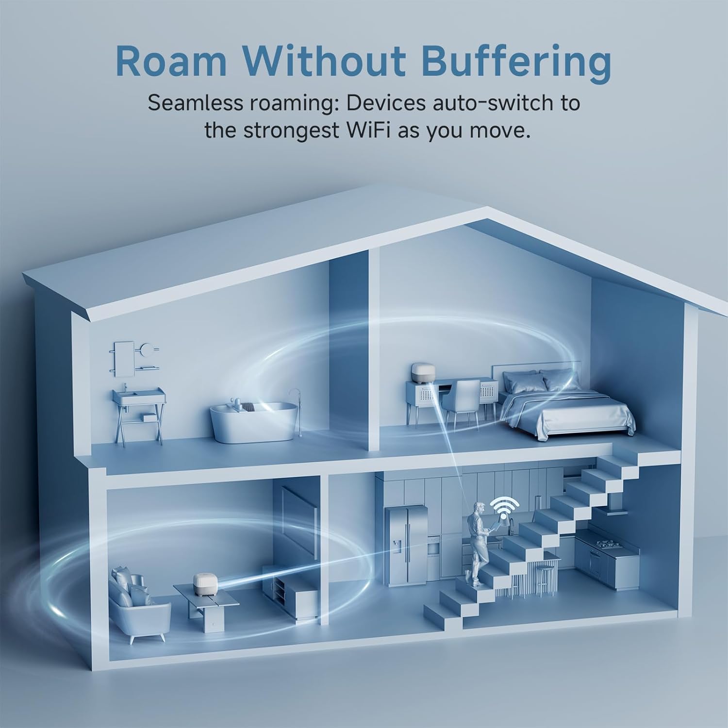 𝐖𝐡𝐨𝐥𝐞-𝐇𝐨𝐦𝐞 𝐒𝐞𝐚𝐦𝐥𝐞𝐬𝐬 𝐂𝐨𝐯𝐞𝐫𝐚𝐠𝐞: Enjoy ultra-stable Wi-Fi in every corner with the AC1200 Mesh System 2-Pack, eliminating dead zones across large homes (up to 4,000 sq ft). With smart roaming technology, your devices switch smoothly between nodes without dropped connections—a superior solution compared to standard WiFi boosters and extenders