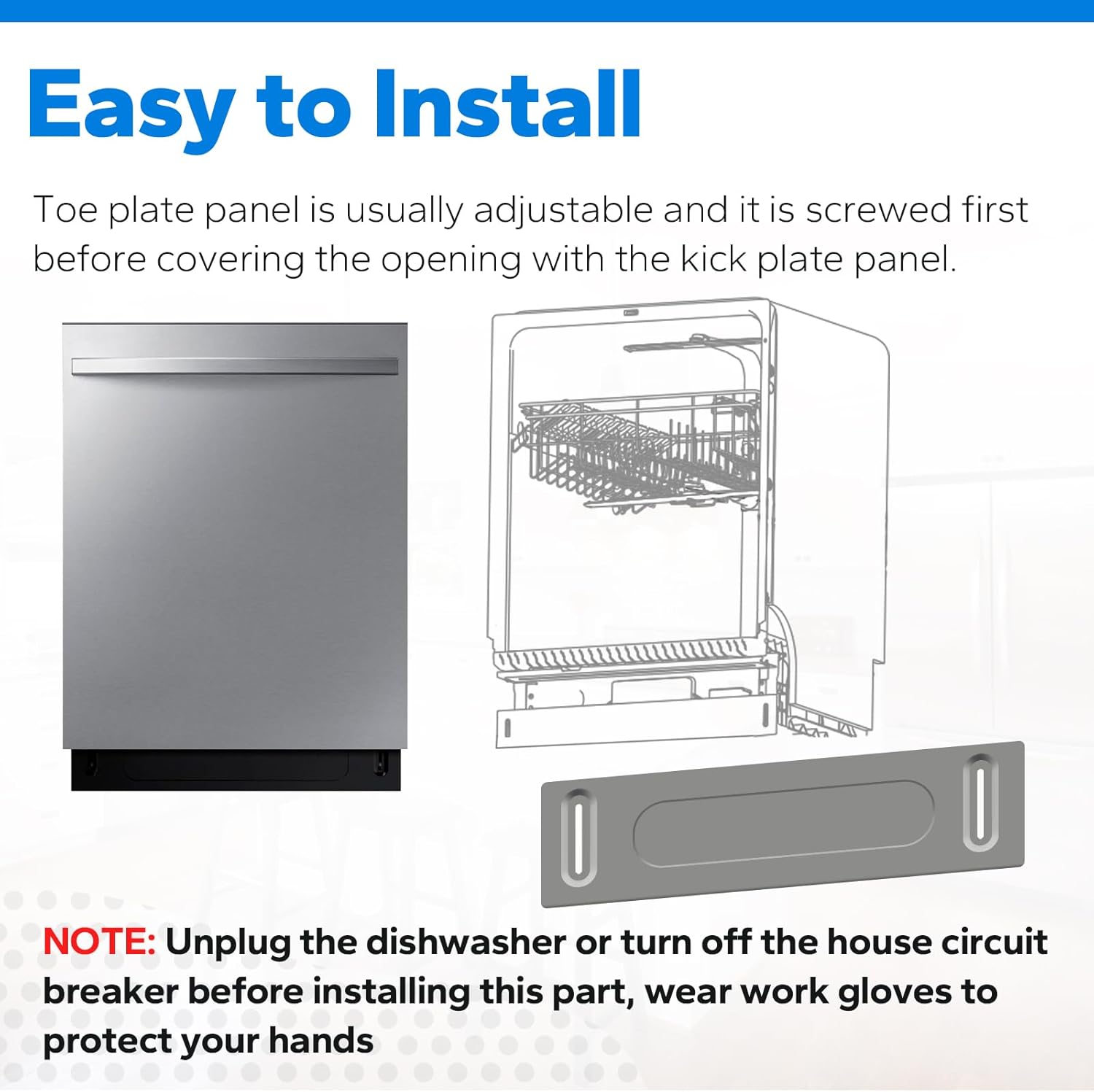 【Easy to Install】Toe plate panel is usually adjustable and it is screwed first before covering the opening with the kick plate panel. Unplug the dishwasher or turn off the house circuit breaker before installing this part. Wear work gloves to protect your hands