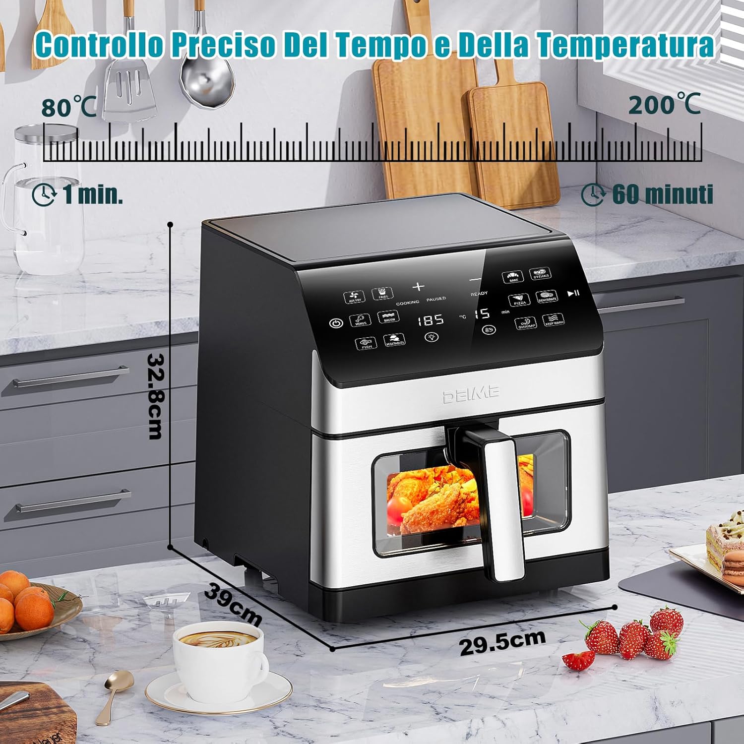Multifunctional Air Fryer: With a 6.5 QT capacity and 1700W power, this air fryer is equipped with a high-definition touch screen, built-in cooking light, and heat insulation viewing windows are designed to be the perfect assistant for your cooking and decoration of your kitchen counter. It can replace a variety of kitchen appliances such as a toaster, rotisserie, fruit dryer, oven, etc., perfect for families who pursue a healthy diet.