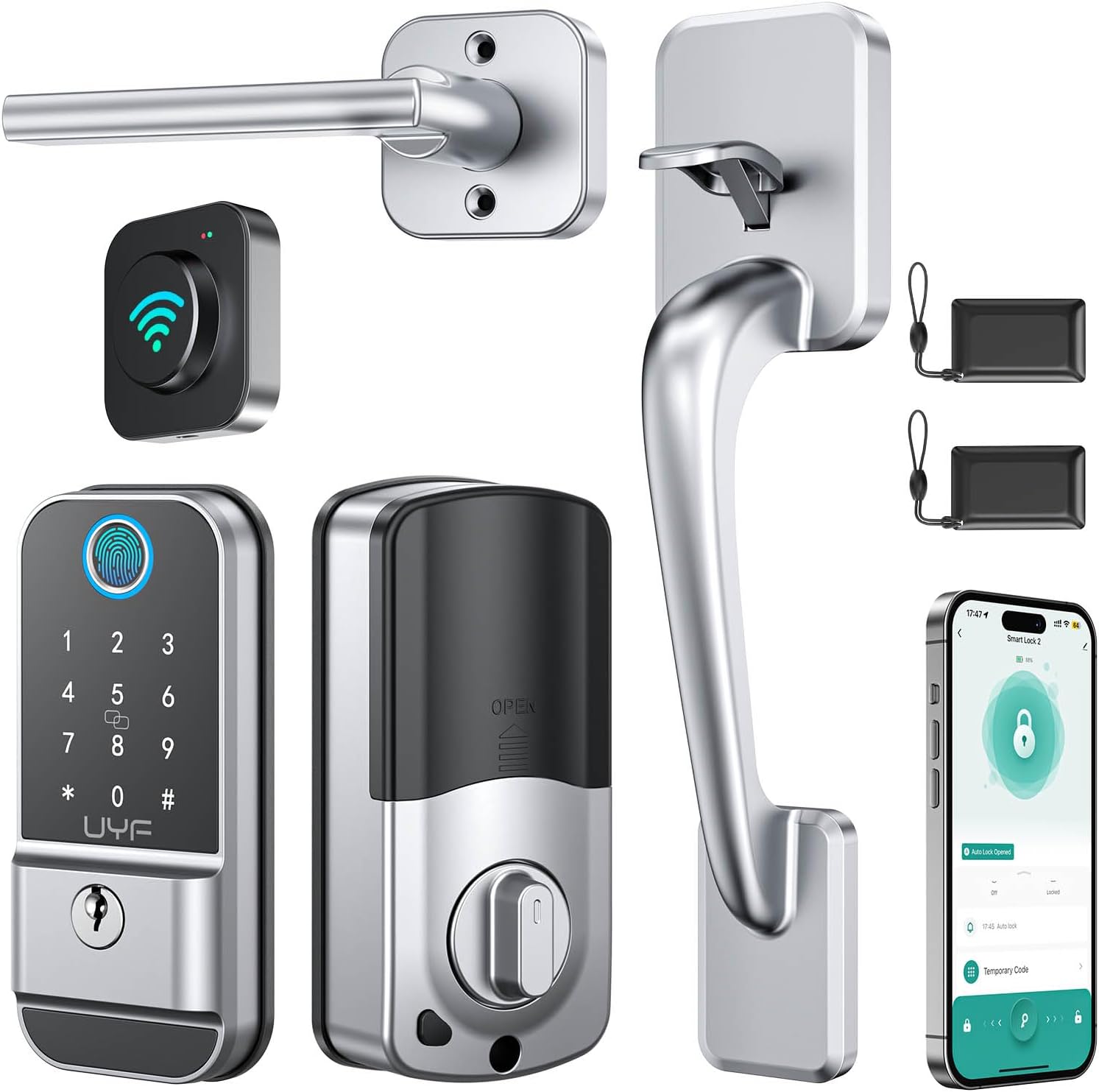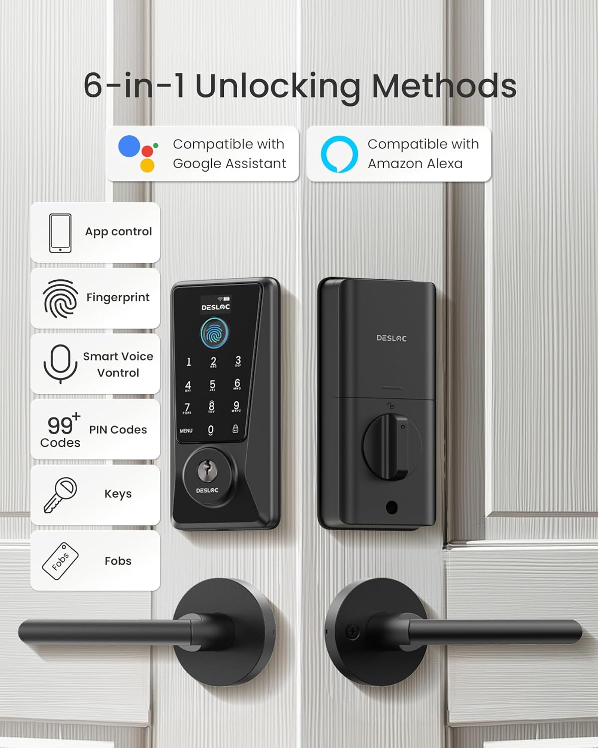 𝟔 𝐖𝐚𝐲𝐬 𝐔𝐧𝐥𝐨𝐜𝐤: Powered by GPTfinger technology, fast unlock the door less than 0.5s with fingerprint. You can also keyless entry with passcodes, voices or app. Or unlock with backup keys and fobs. Compatible with Google Assistant and Alexa