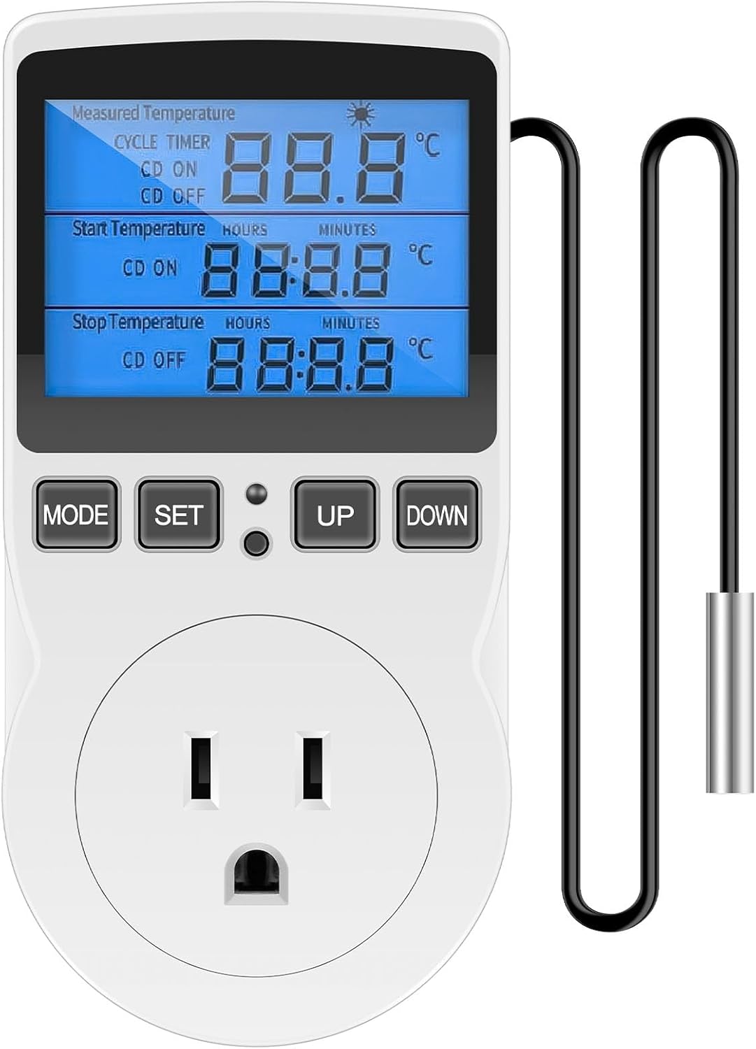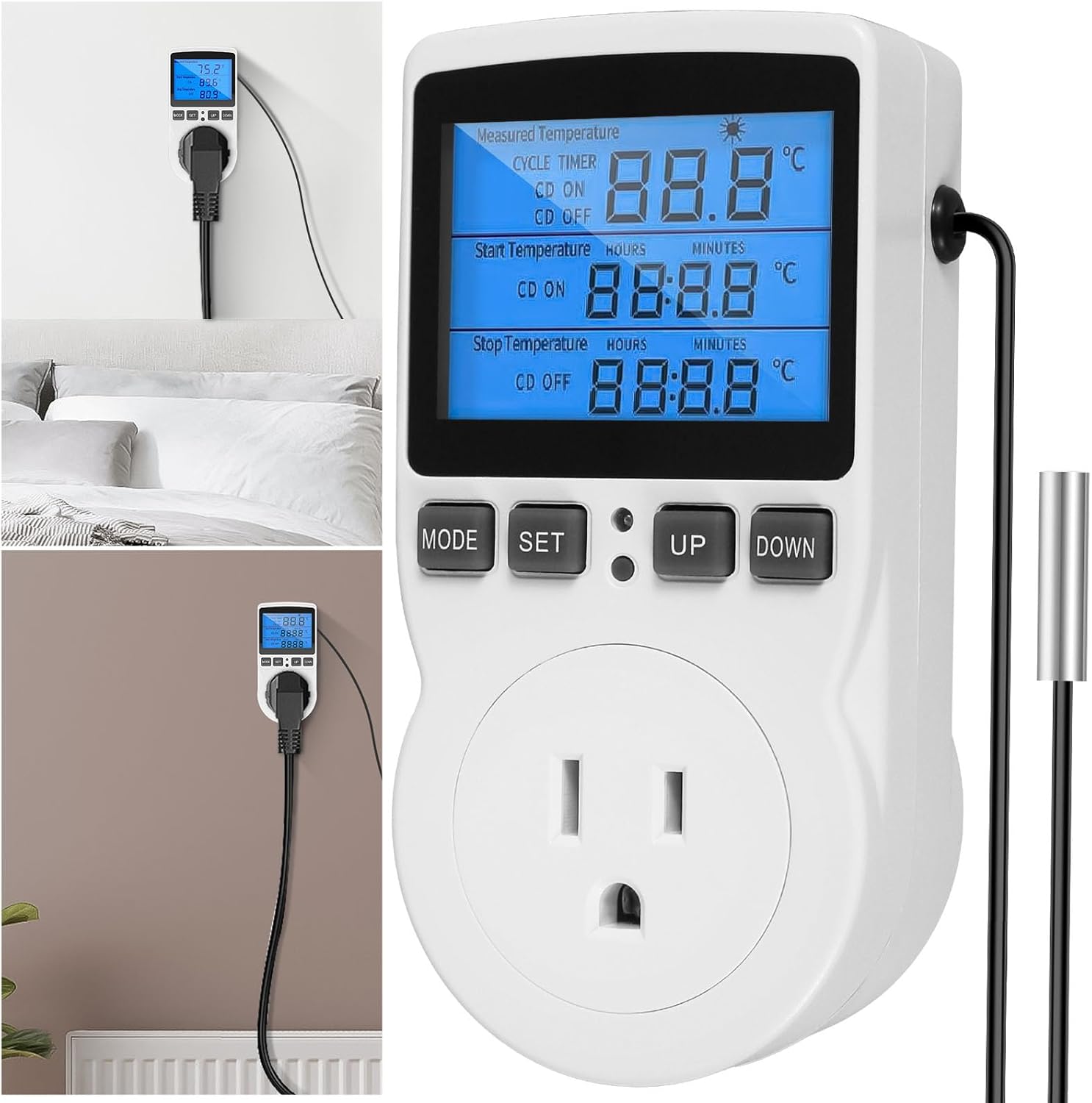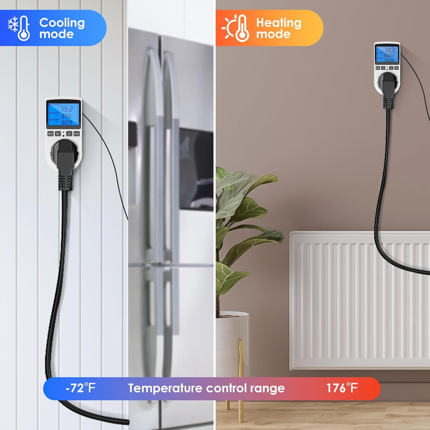 【Thermostat Temperature Controller Socket: Safe and Easy to Operate】The thermostat temperature controller socket described is a convenient and safe device for programmable temperature control. Simply plug it into an outlet, select the timing mode, and set the start and stop temperatures to regulate heating or cooling equipment. The temperature control range is -72°F to 176°F, with an output of a maximum of 15A/120V 1800W.