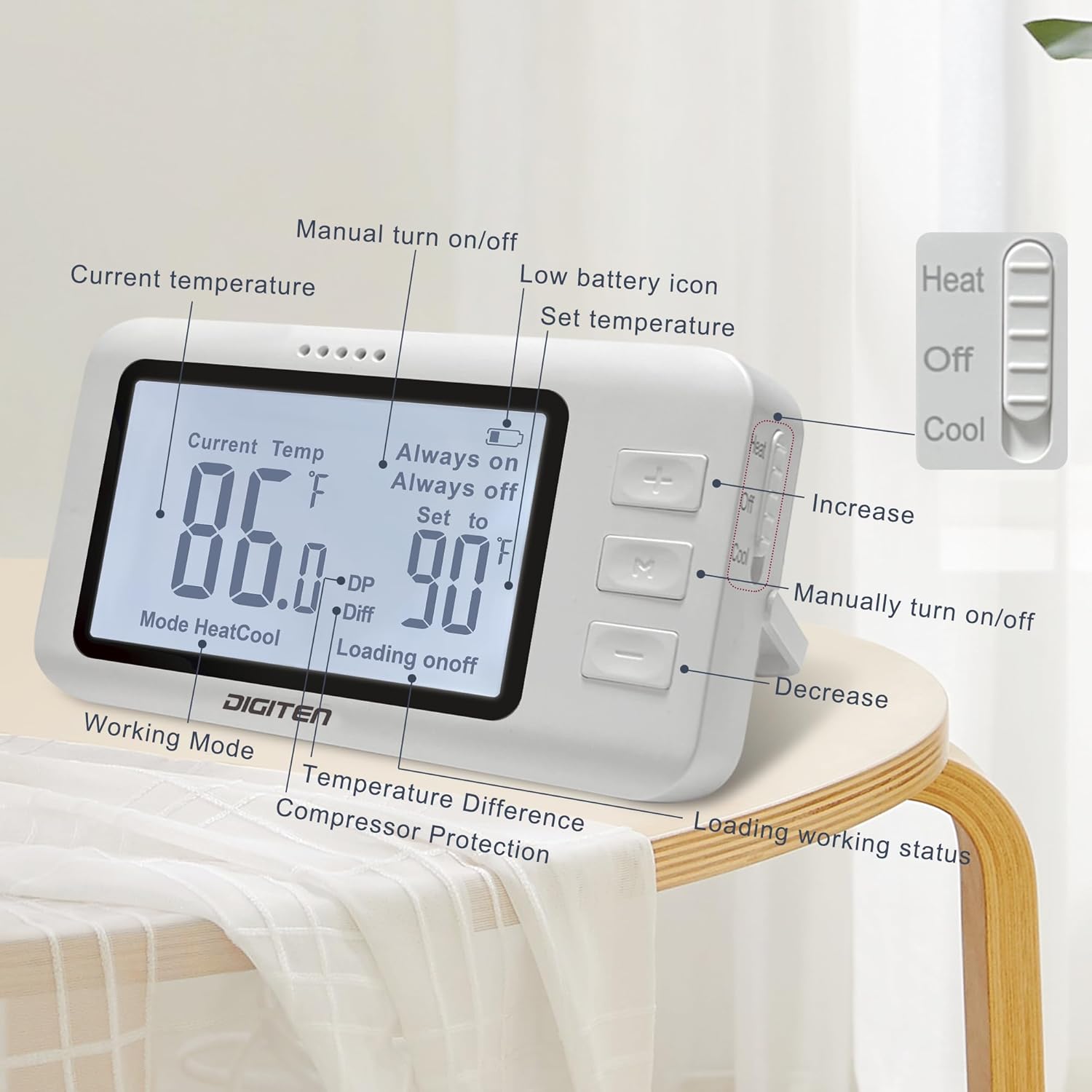 Variety of Uses: With a large LCD screen featuring a backlight function, our Plug-in Thermostat outlet is versatile and suitable for controlling the temperature of various appliances,such as air conditioners, fans, greenhouses, mushroom houses, reptile feeding, pet feeding, and is a must-have for the home or outdoors.Note:Remote Batteries Required:2pcs 1.5A AAA(Not Included)