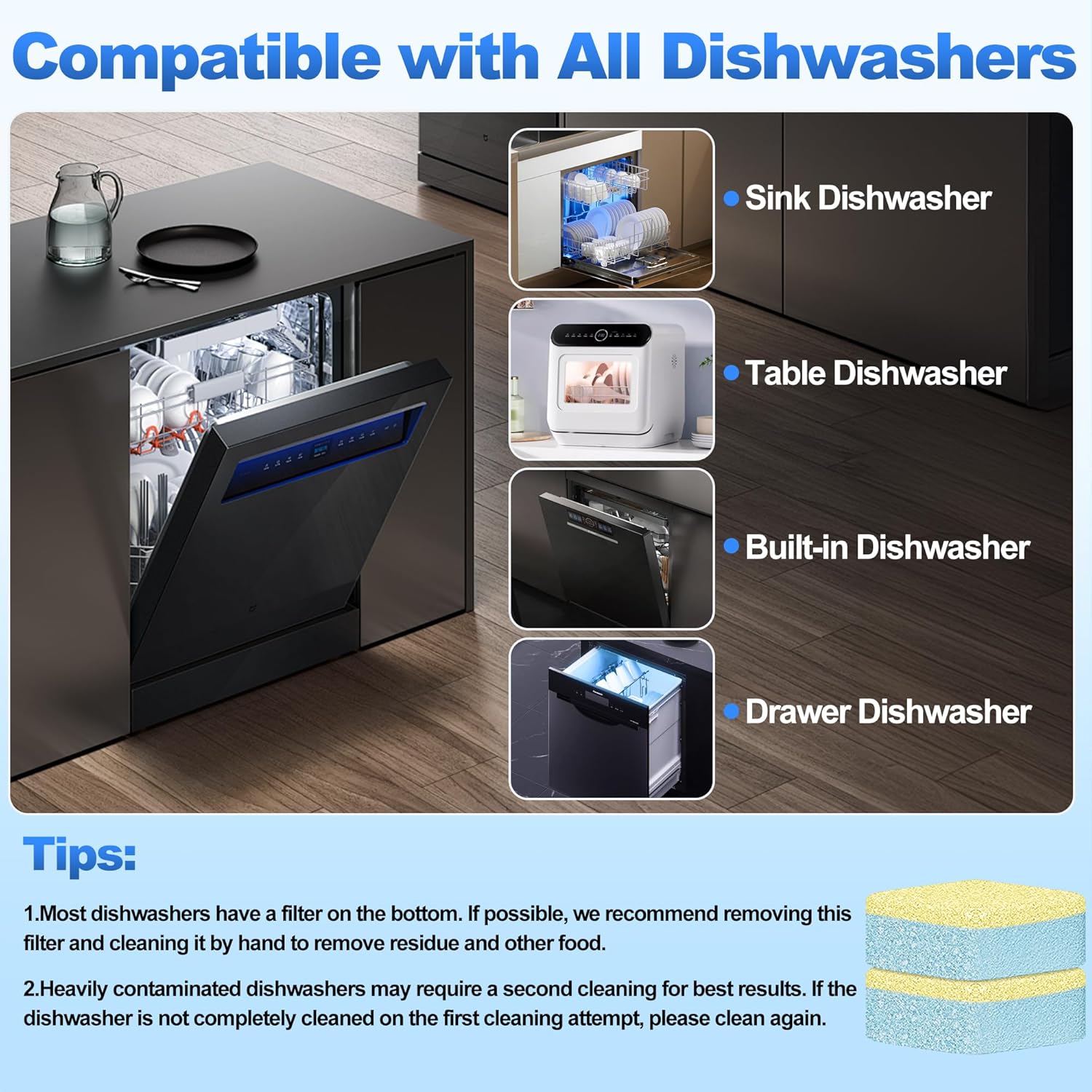 👍Universal Compatibility: Our dish washer cleaner tablets are suitable for use with all types of dishwashers and materials, including stainless steel and plastic. Enjoy a more convenient, clutter-free kitchen. Ideal for both household and commercial use.