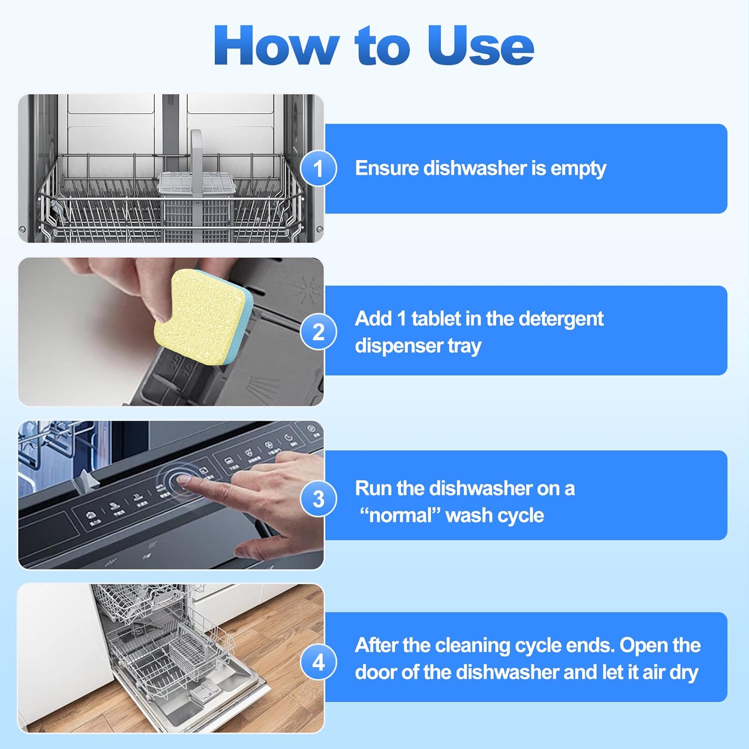 Dishwasher cleaner and deodorizer effectively removes grease, grime, limescale, buildup, and odor causing residue. Just use one or two tablets per month. If extra cleaning is needed, always perform two separate cleaning cycles with a single or two tablet each, adding more dishwasher cleaning tablets can result in excess foam that effects function.