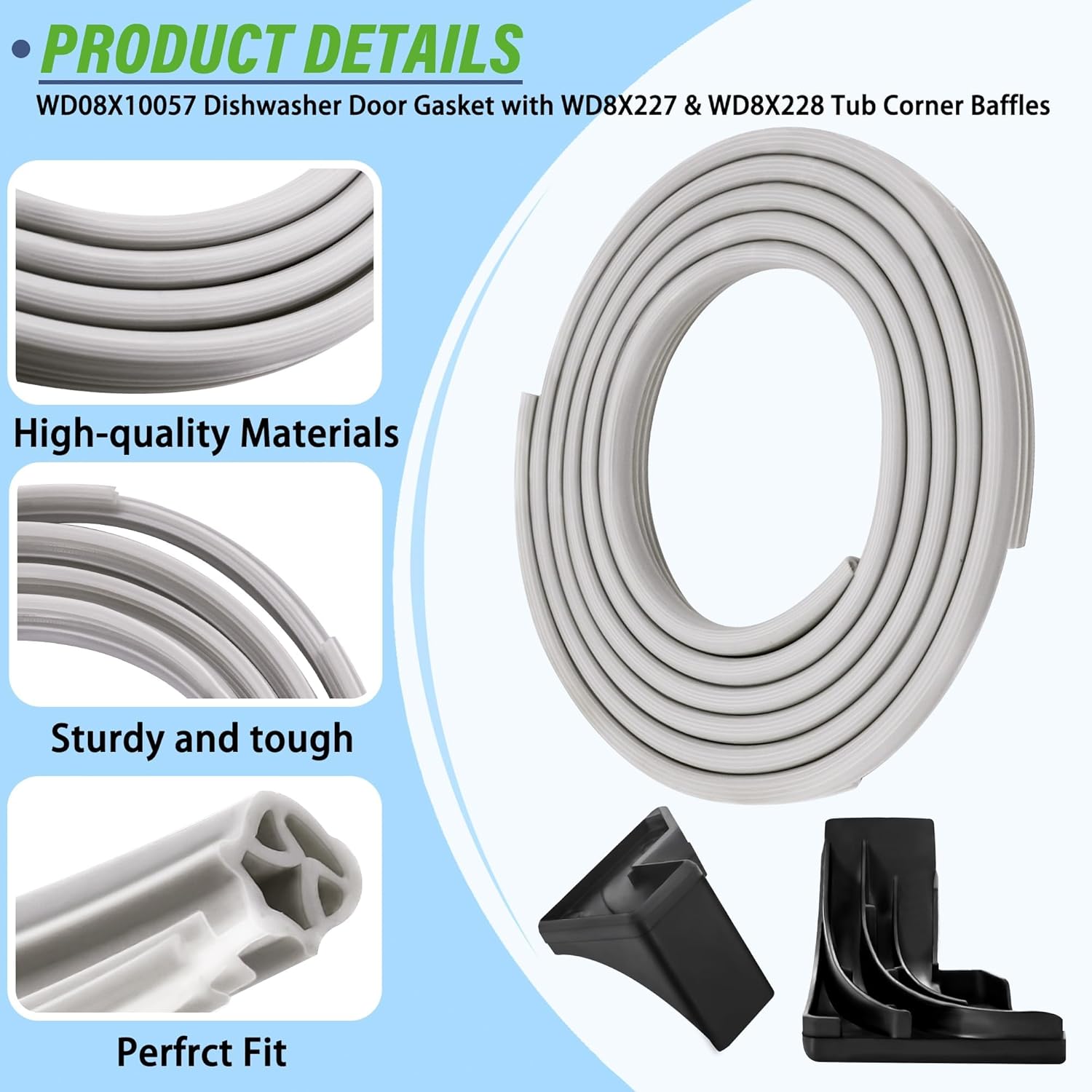 Perfect Fit: WD08X10057 Dishwasher Door Gasket with WD8X227 & WD8X228 fit for GE dishwashers GHD1106F00WW, GHD3515F00AA, GHD3525F00BB, GHD3535F00WW, GHD5015F00AA, GHD5015F01AA, GHD5025F00BB, GHD5025F01BB, GHD5035F00WW, GHDA350N00BB, GHDA350N00WW, GHDA350N10BB, GHDA350N10WW, GHDA350N20BB, GHDA350N20WW, GHDA356N00SS, GHDA356N20SS, GSC3200F01BL, GSC3200G00BB, GSC3200G00WW, GSC3200G01BB, GSC3200G01WW, GSC3200J01BB, GSC3200J01WW, GSC3200Z02BL, GSC3200Z03BL, GSC3230Z02WW, GSC3230Z03WW, GSC3400G00BB, GSC3400G00WW, GSC3400J00BB, GSC3400J00WW, GSC3430Z02WW, GSC3500D00BB, GSC3500D00WW, etc