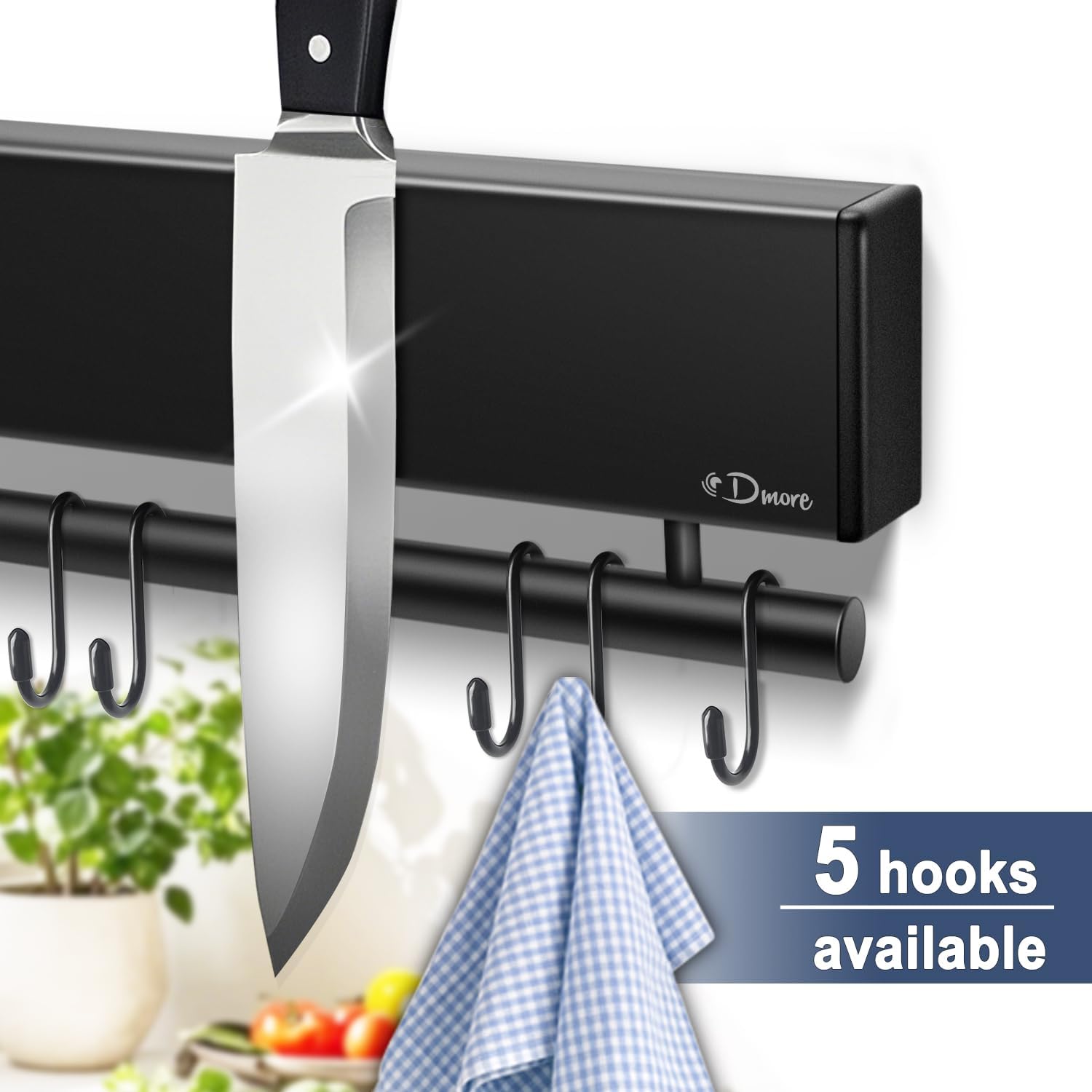 Dmore magnetic knife holder for wall—with 5 hooks, No Drilling 12 Inch black knife magnetic strip, Extra Strong Magnet knife rack, include Adhesive Tape and screws for Knives and Tools