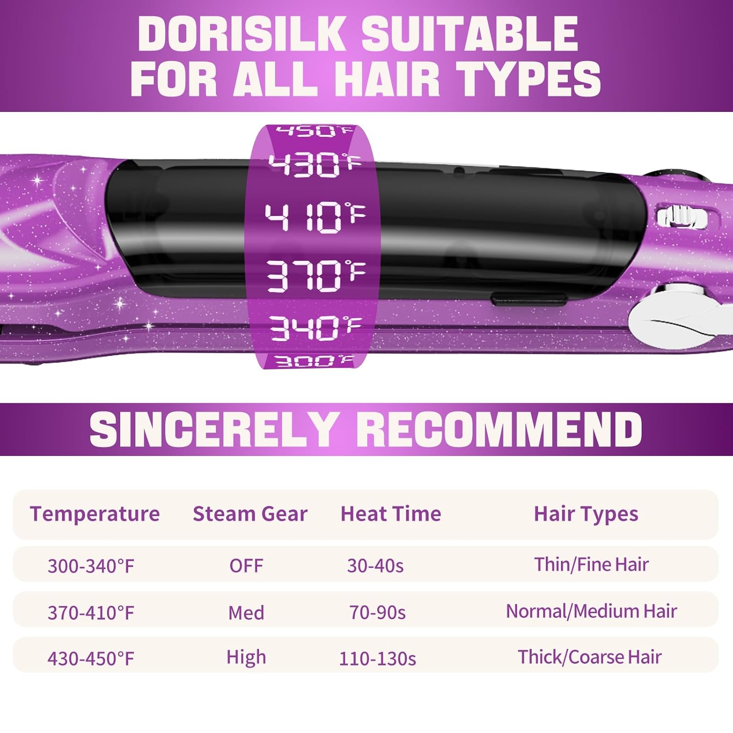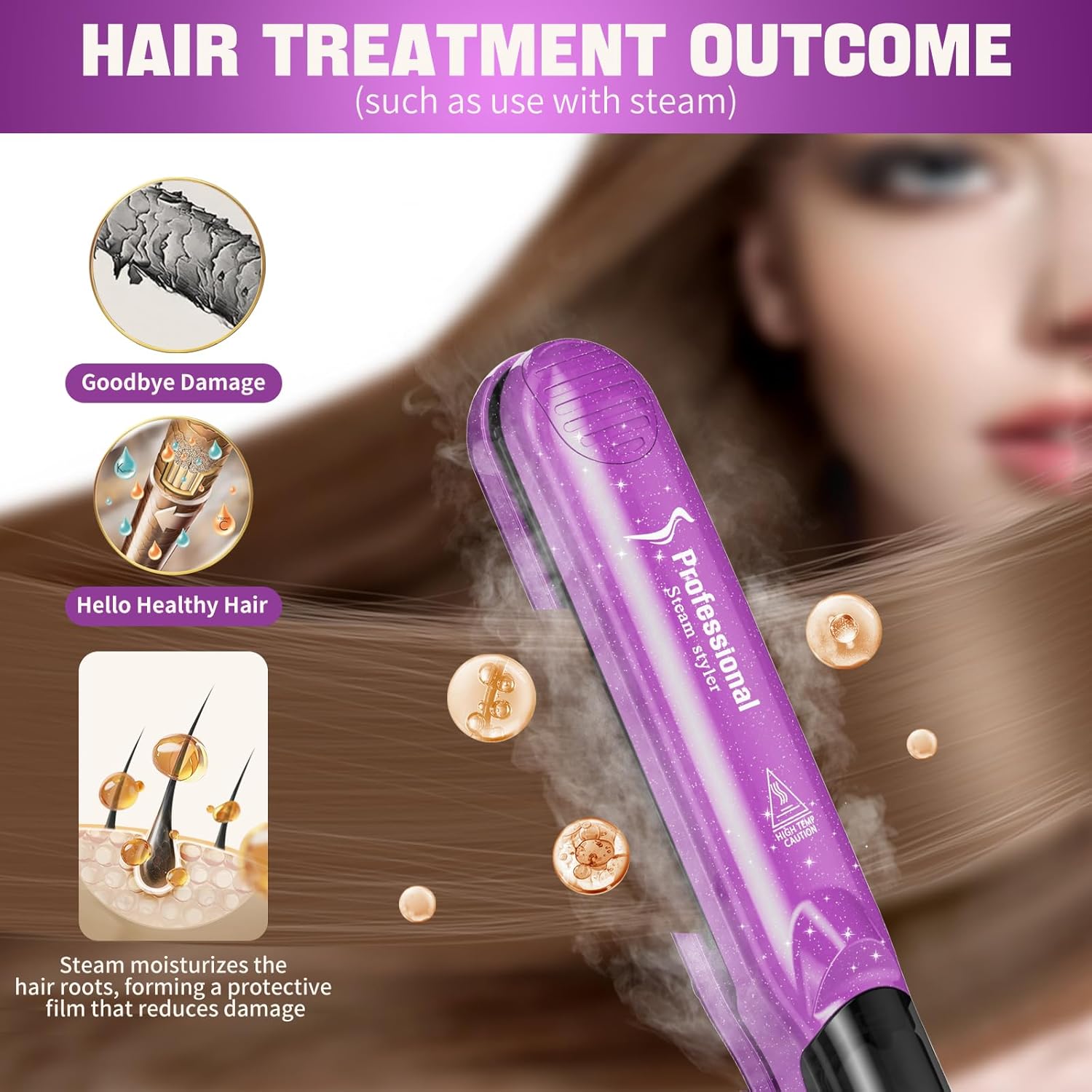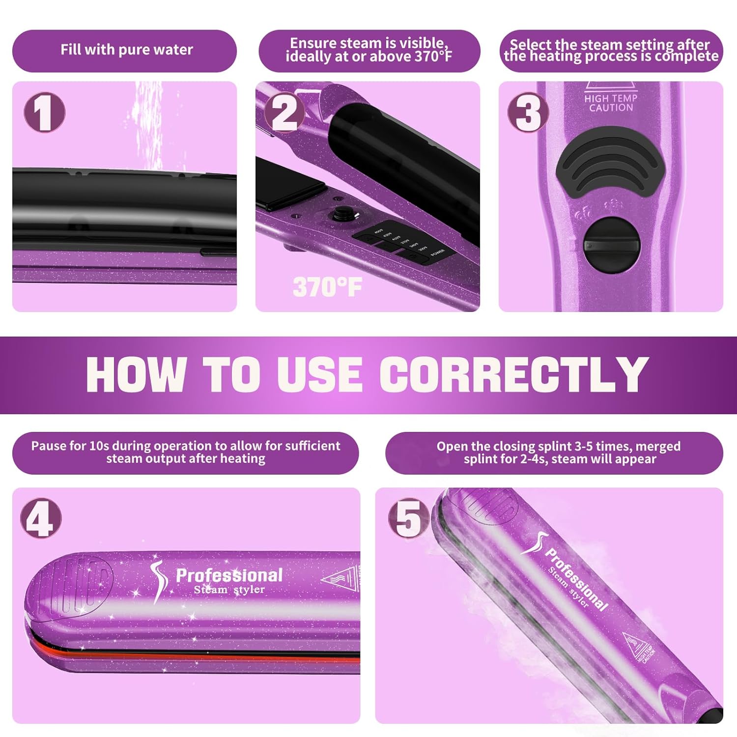 ✔𝟐 𝐢𝐧 𝟏 𝐒𝐭𝐫𝐚𝐢𝐠𝐡𝐭𝐞𝐧𝐬 & 𝐂𝐮𝐫𝐥𝐬: Enjoy a device for creating multiple hairstyles effortlessly, meeting any straight and curly hairstyles you want. Featuring a 3D flexible floating plate design, it ensures perfect results without snagging or pulling for your hair. You have the option to use the styler as a regular straightener by closing the steam function, providing a silky-smooth finish. Refrain from touching the splint while in use and wear the provided glove for added safety.