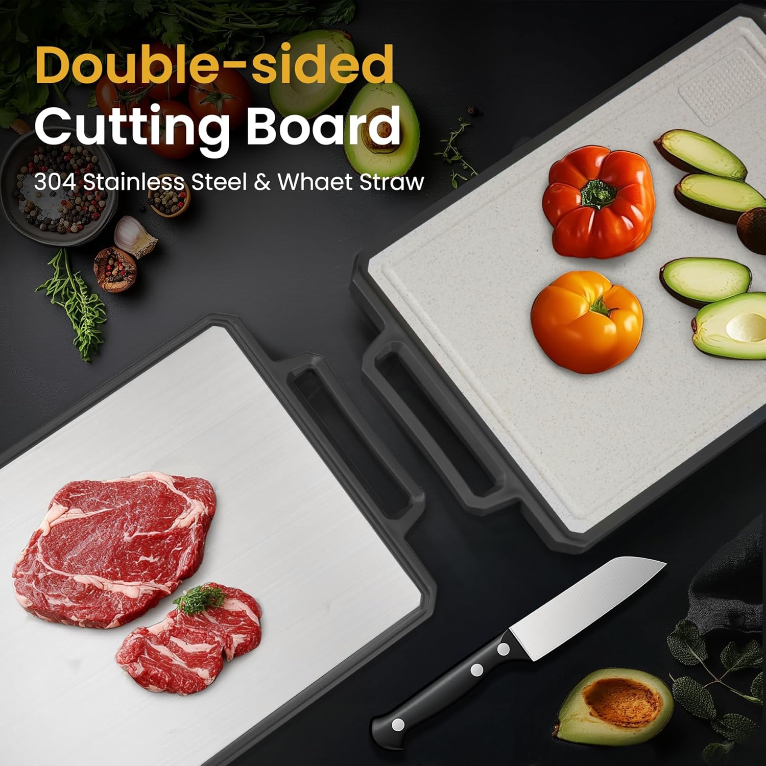 Dual-Sided Cutting for Versatile Use:The Foressic cutting board features 304 stainless steel on one side and food-grade PP on the other, ensuring durability and safety. This dual-sided cutting board is BPA-free, making it safe for direct food contact. Perfect for slicing meats or chopping fruits and vegetables, its sturdy construction resists wear and tear, providing a reliable, long-lasting solution for all your kitchen tasks.
