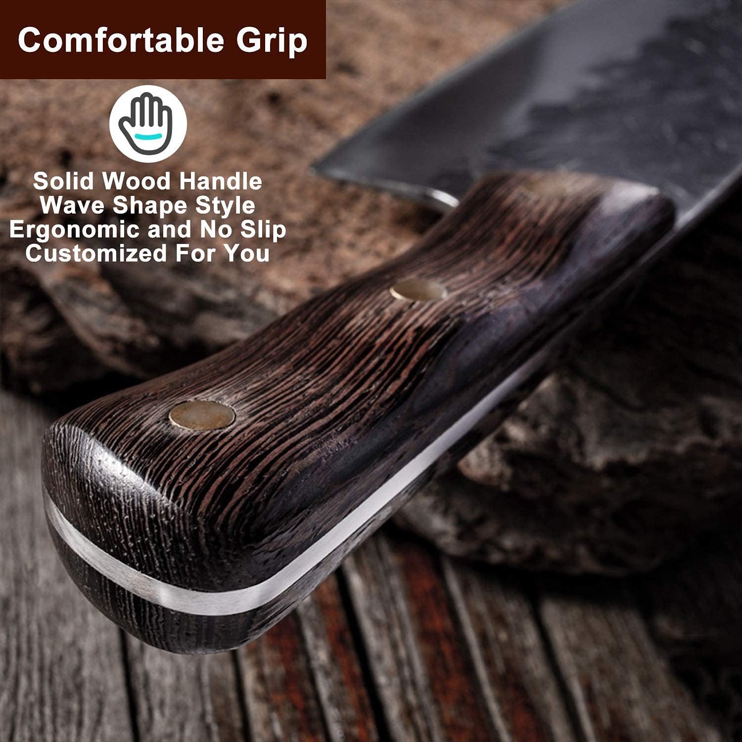 Ergonomic Handle — Wave shape Full Tang handle design of the chef knife makes it easy to grip and hassle-free maneuvering, and can prevent the meat cleaver breaking down or dropping. Premium Wenge Wood Handle enhances the handholds touch to make the knife easy to hold, so you will not feel tired for using a long time.