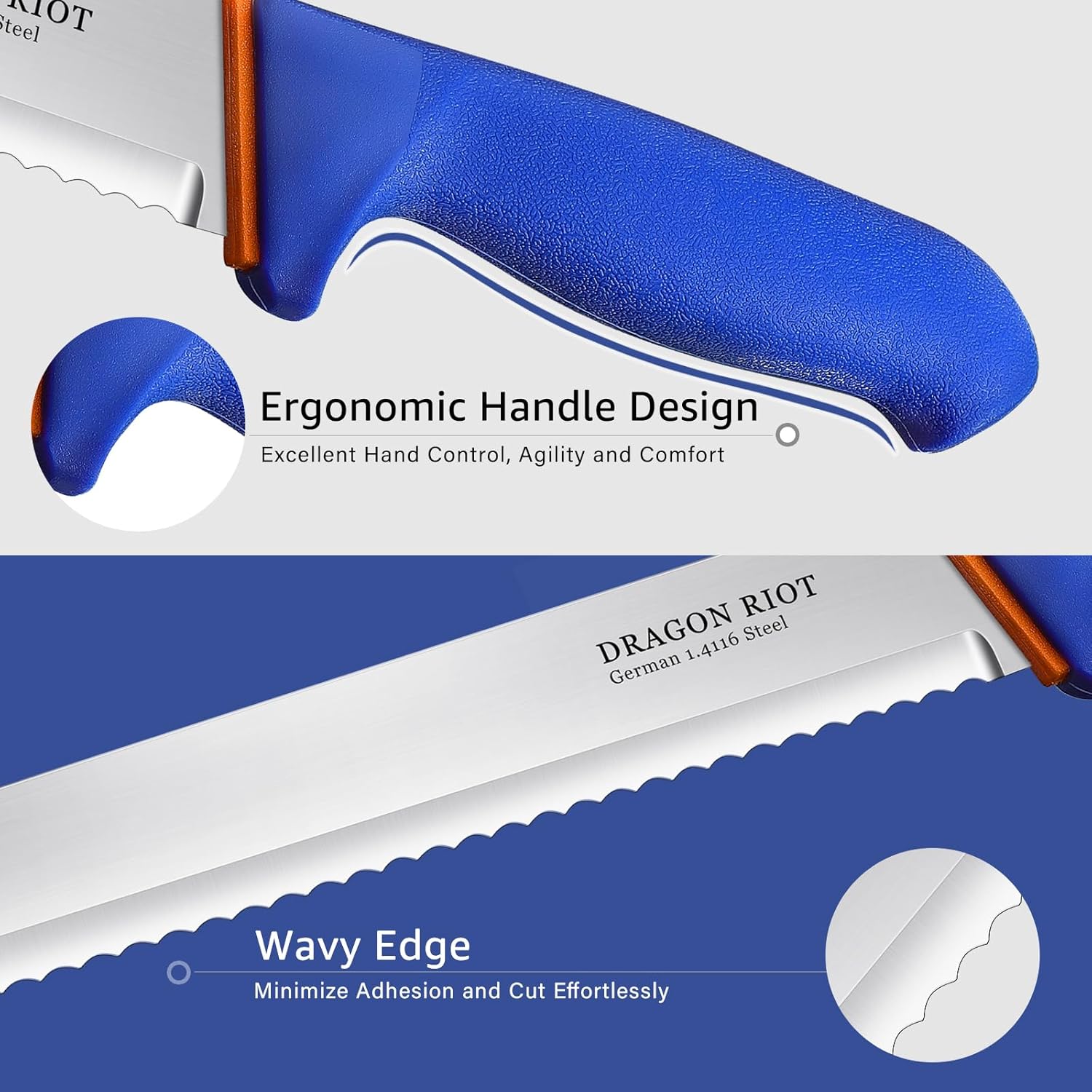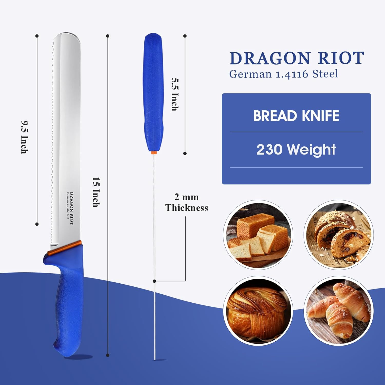 Super Sharp Bread Knife — With the maximal hardness 58±2 HRC and 2.0mm ultra-thin blade, this bread knife has ultra-sharp wavy edge cutting edge,for maximum sharpness ensuring maximum cutting performance and durability.Its versatile design makes it a valuable addition to any kitchen arsenal.
