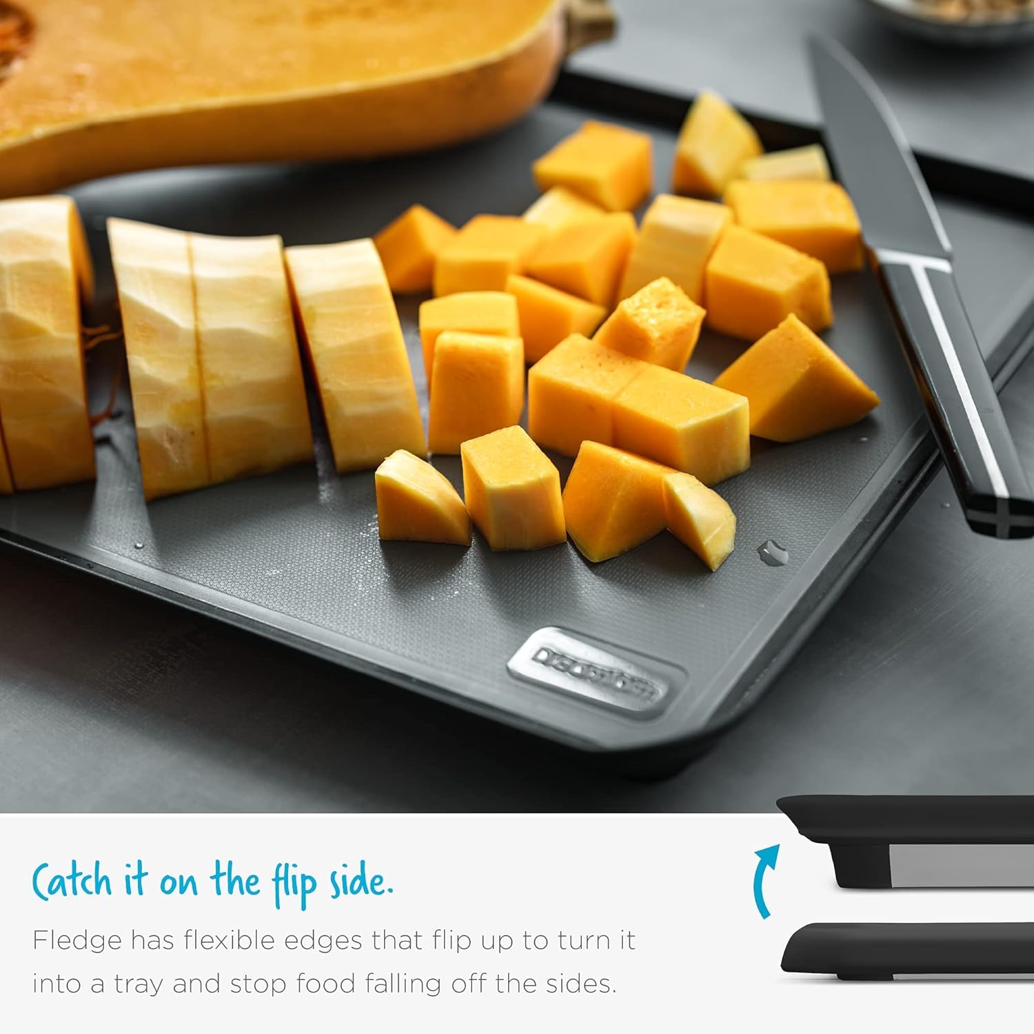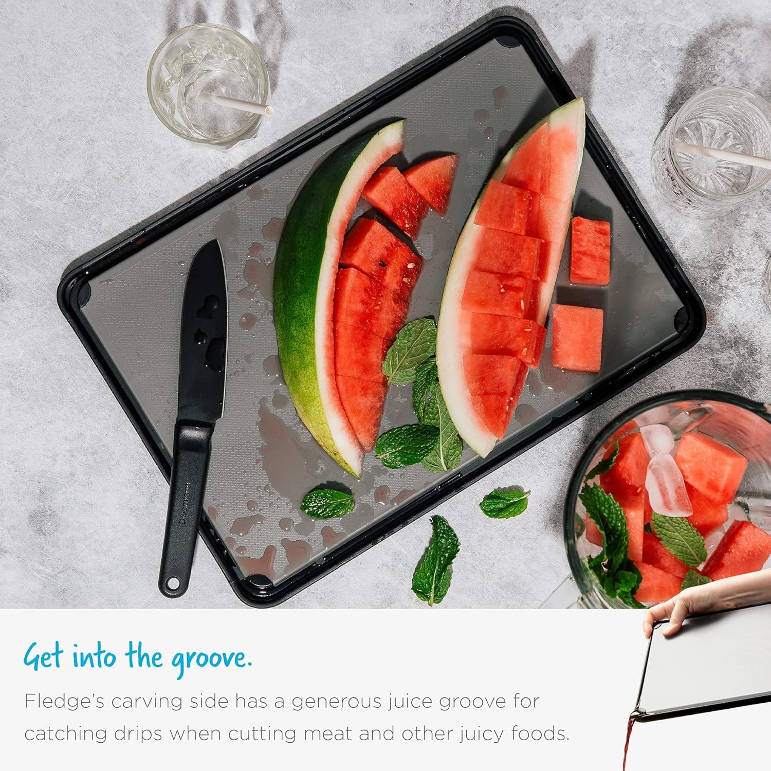 CUTTING FLEDGE | Did you know that a Fledge has a flippable edge? Our double sided cutting board has unique flip up edges, to help you cut, transport, and serve your food with ease. Say goodbye to leaks and spills.