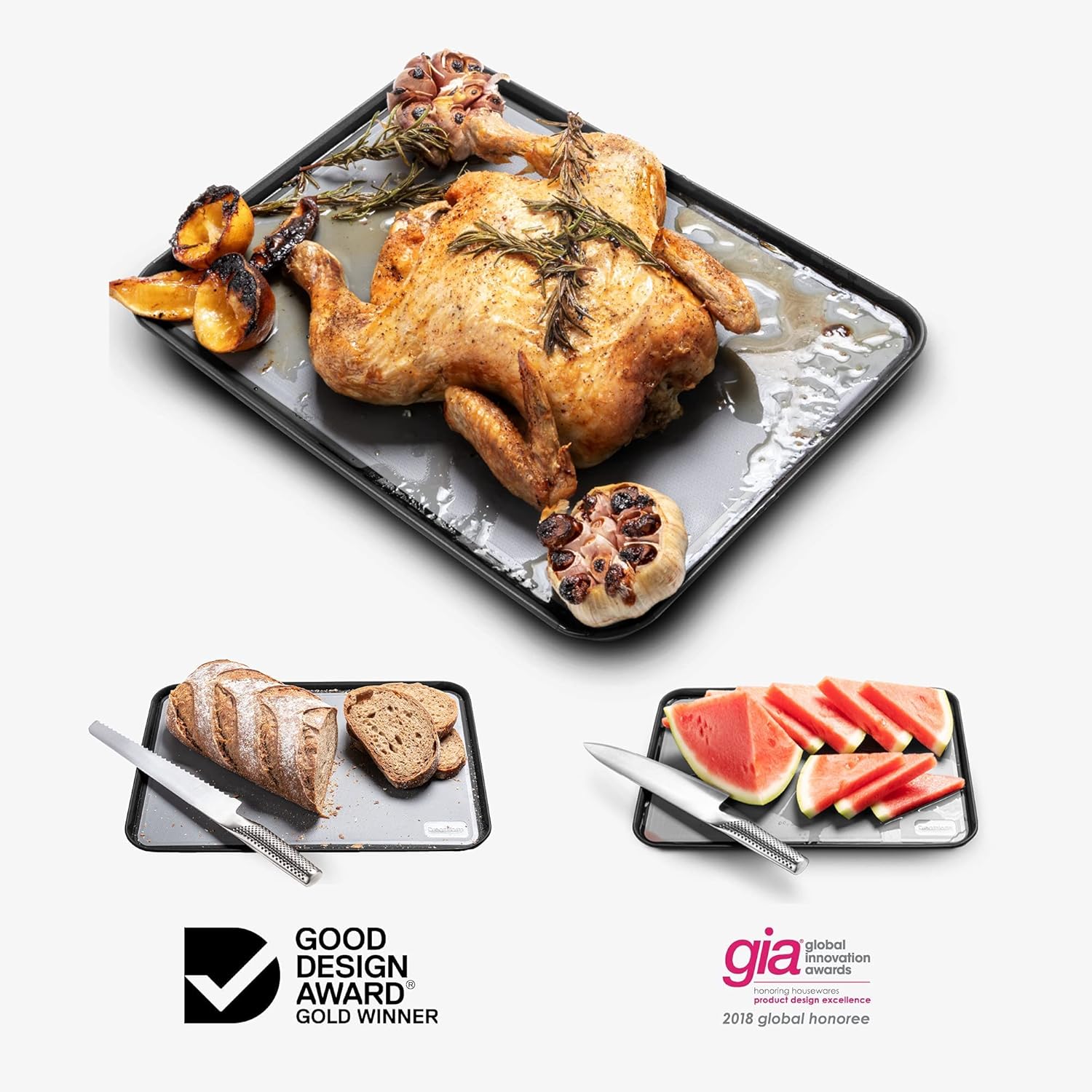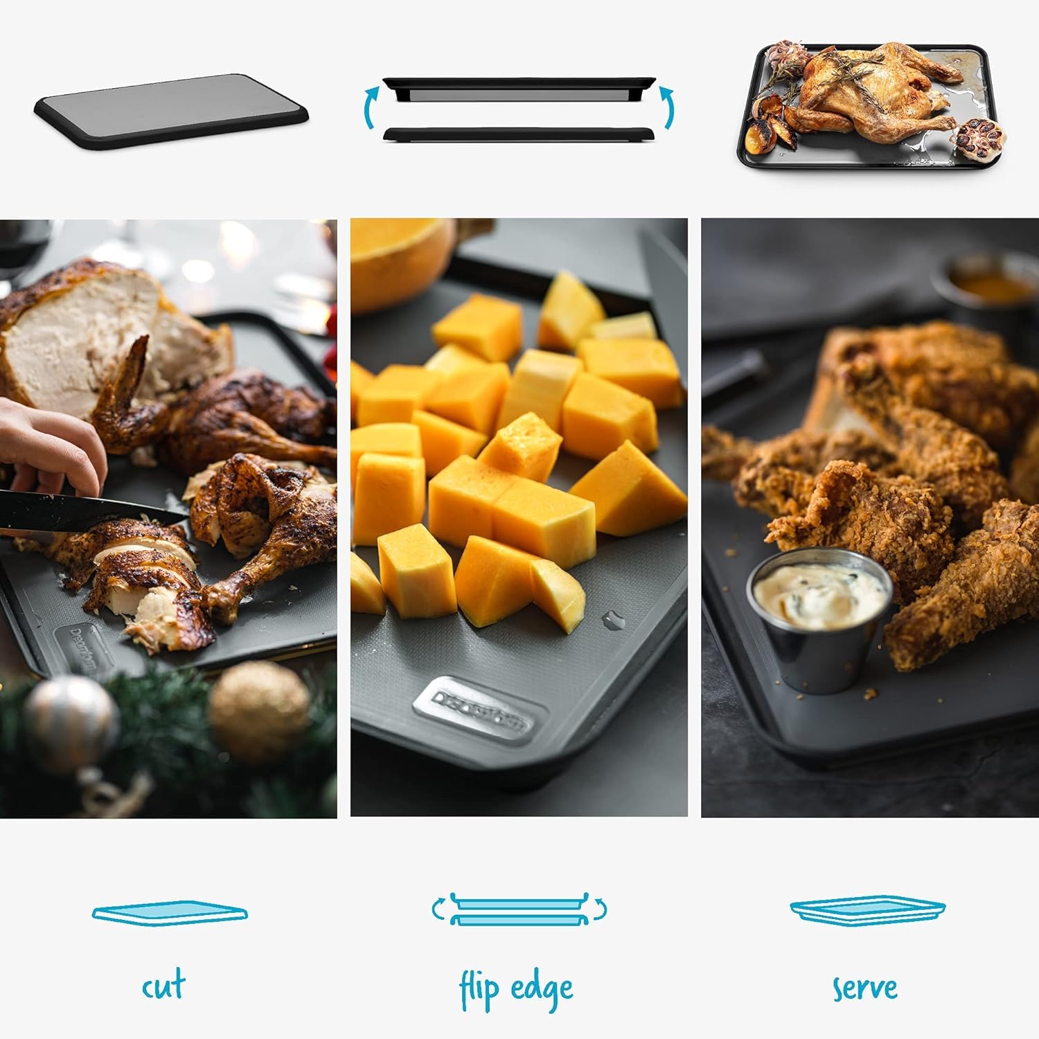 ON THE FLIP SIDE | This isn’t your everyday cutting board. Flip the polypropylene edge and you get a fully-fledged serving tray. Nothing can roll away! Transport food from counter to pot, then serve your food right to the table