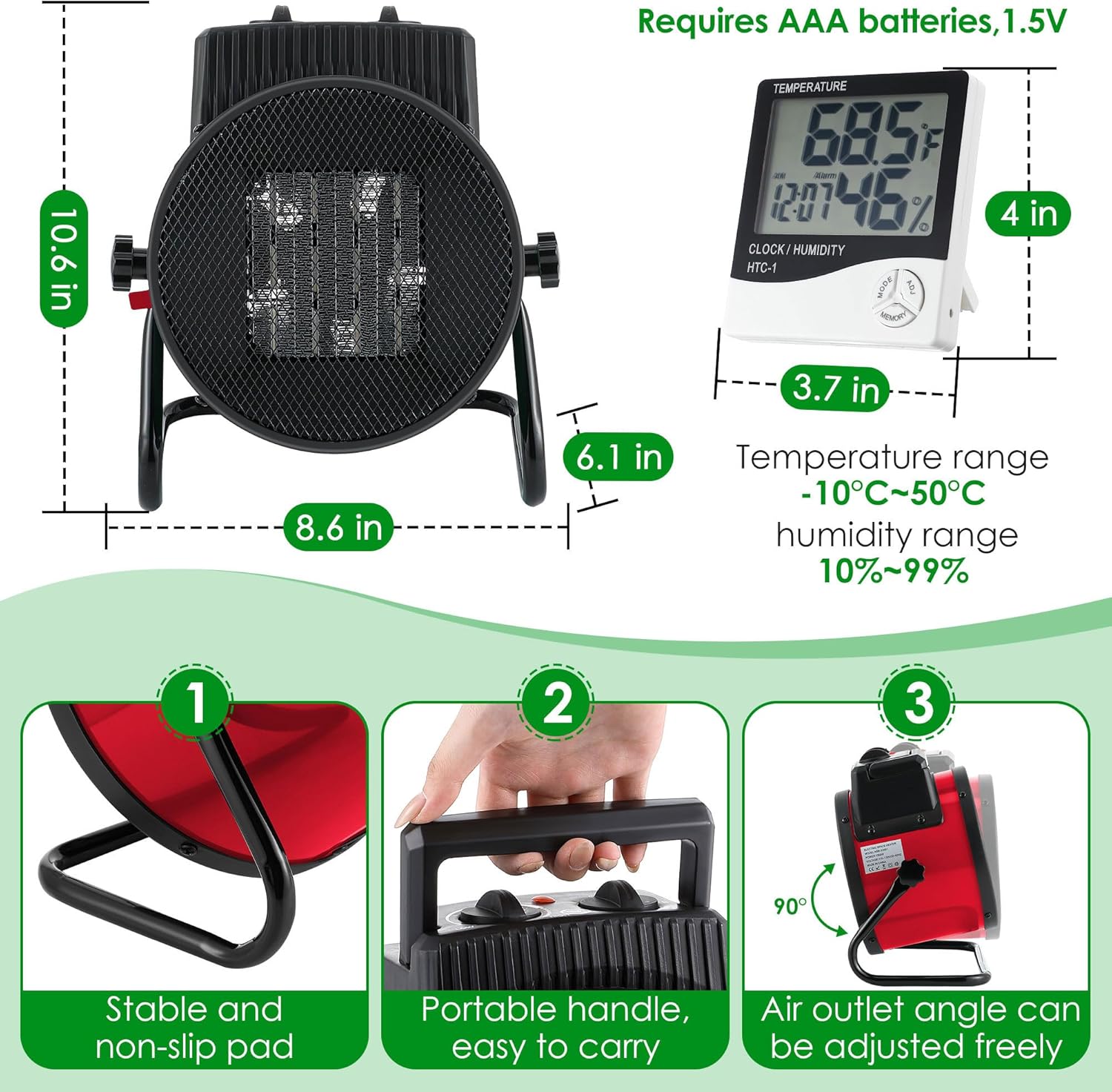 User Friendly Design, Convenient Operation: the electric greenhouse heater is equipped with a high power copper motor for efficiency and low energy consumption, smooth and quiet performance; Additional temperature and humidity monitors enable real time indoor climate monitoring; The handle and base are non slip and easy to move, and the air outlet angle can be adjusted freely