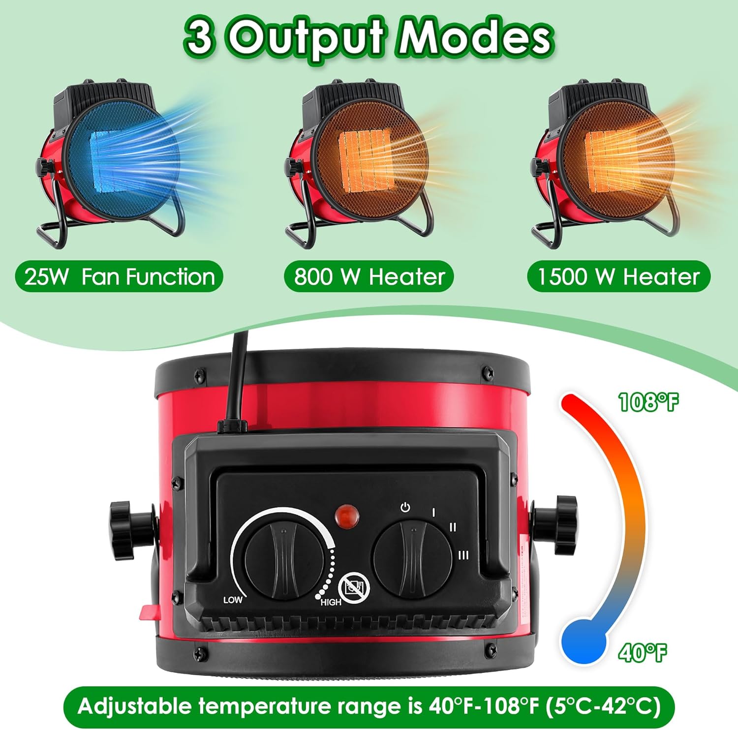 3 Output Modes for Accurate Climate Control: this greenhouse heater has 3 output modes: 25W Fan / 800W Heat / 1500W Heat, adjustable temperature range is 40°F-108°F (5°C-42°C), suitable for 120 sq. ft. Spaces; You can adjust the temperature according to plant growing conditions or other different needs