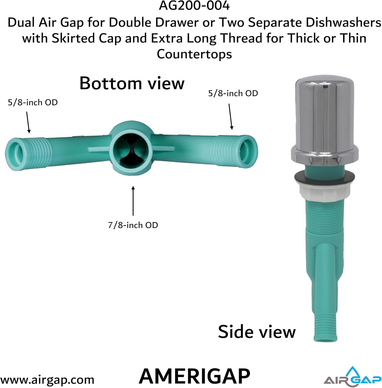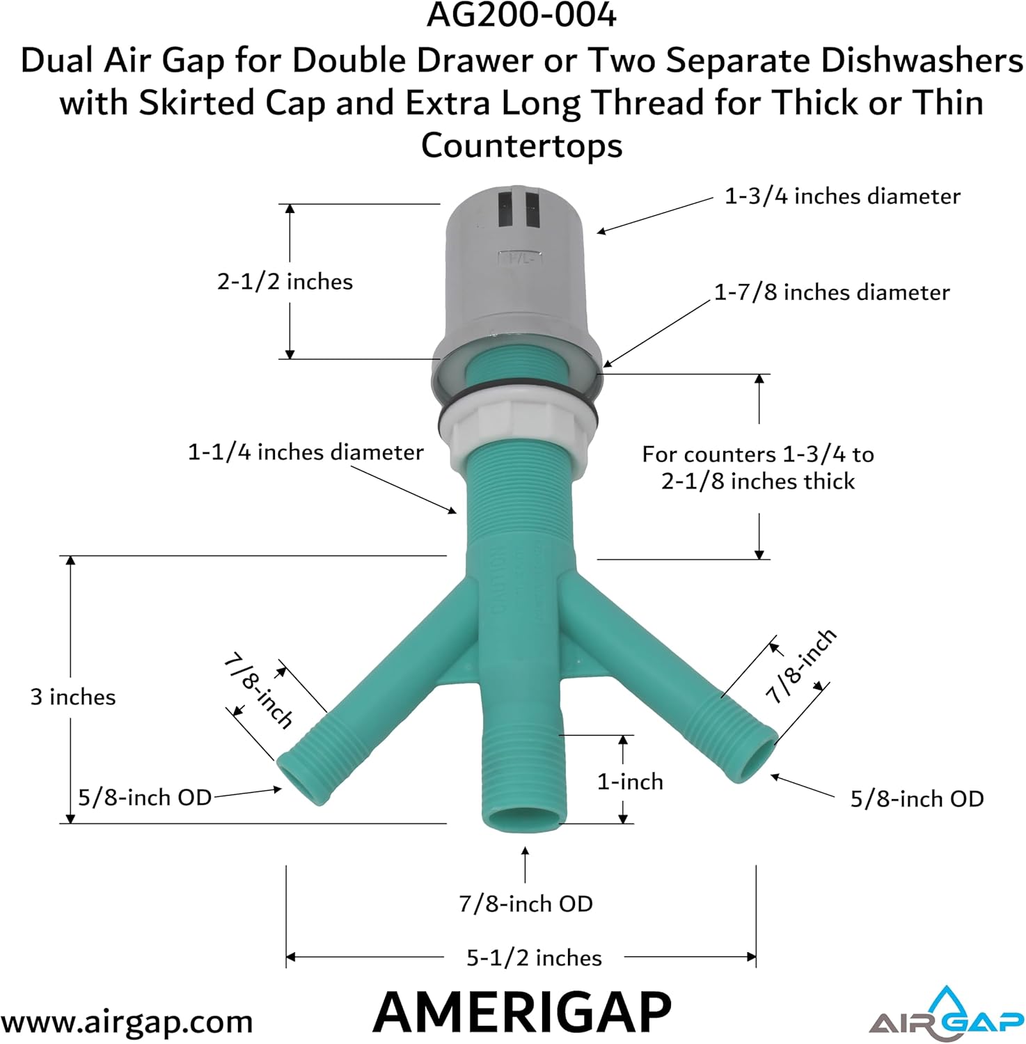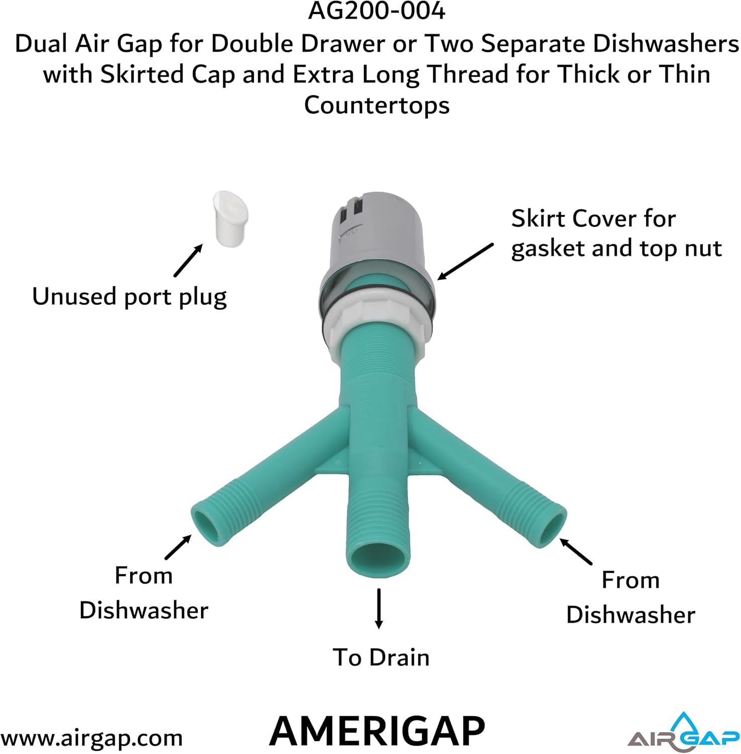 ❤ INLET PORTS: The AG200-004 accepts two standard 5/8-inch inside diameter hoses from a dual dishwasher. The hoses from the dishwasher slide onto the side ports and are secured using stainless worm clamps (not included). Make sure there are no kinks in the hose and that water passes freely. Both sides of the dishwasher can be operational at the same time. This air gap is compatible with all dual dishwashers.
