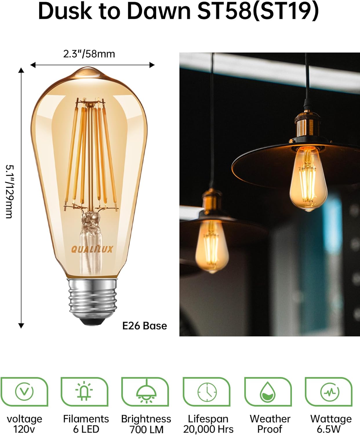 ✅【Support Close Range Use】Supported by QUALILUX unique technology, these ST58(ST19) light sensing bulbs can recognize their own light and other light, which is a perfect solution for arranging two or more bulbs closely as they won’t interfere with each other. Notice: This function is only applicable to QUALILUX Dusk to Dawn Bulb. Other brands of lights will make it go out.