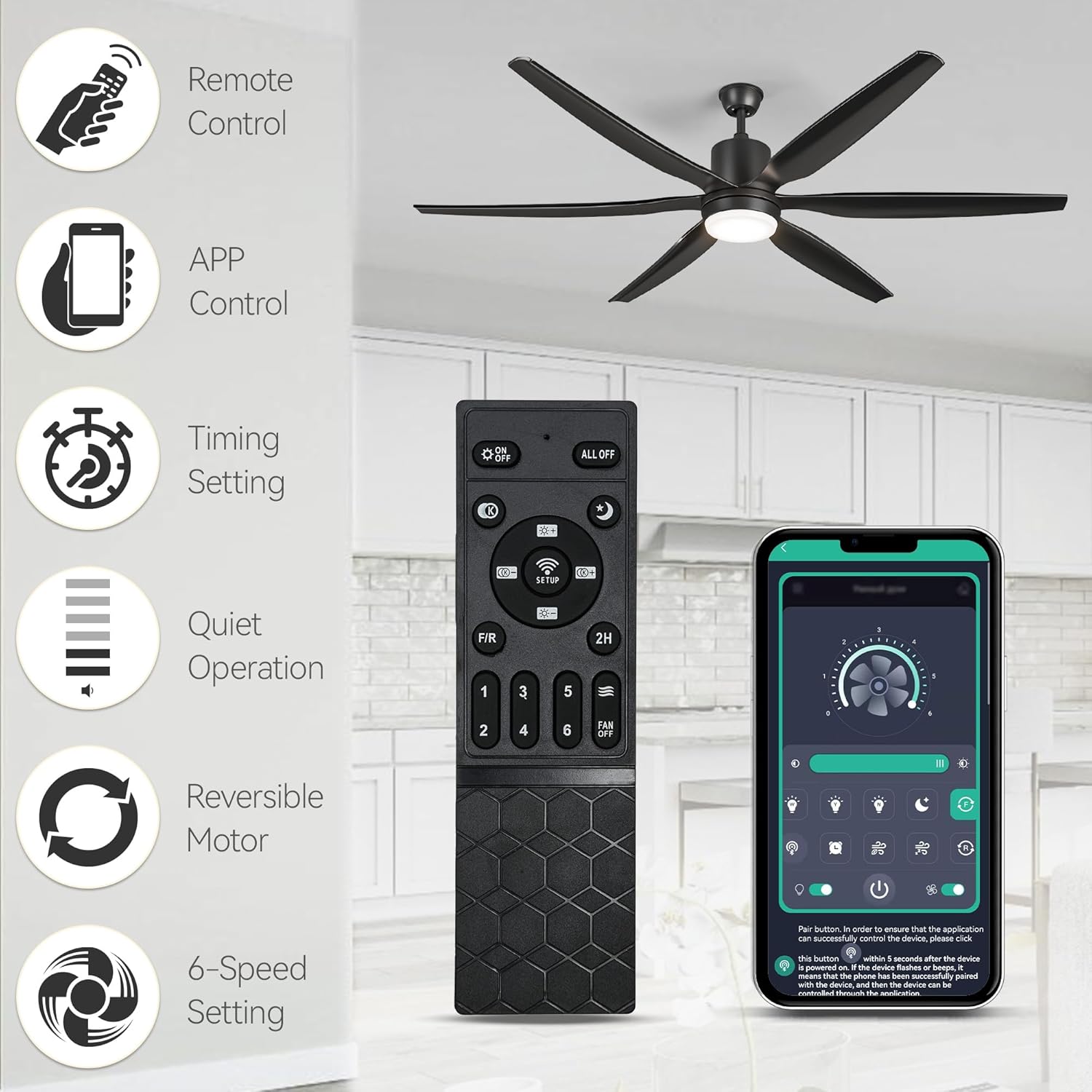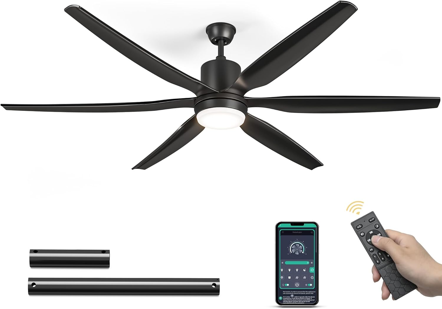 APP Control and Remote Control: This ceiling fan can be controlled by remote control, or you can use your cell phone to log in the corresponding APP (there is a tutorial inside the manual) to operate the ceiling fan light. For example: you can adjust the fan speed, timer setting and rotating direction through the remote control or mobile app