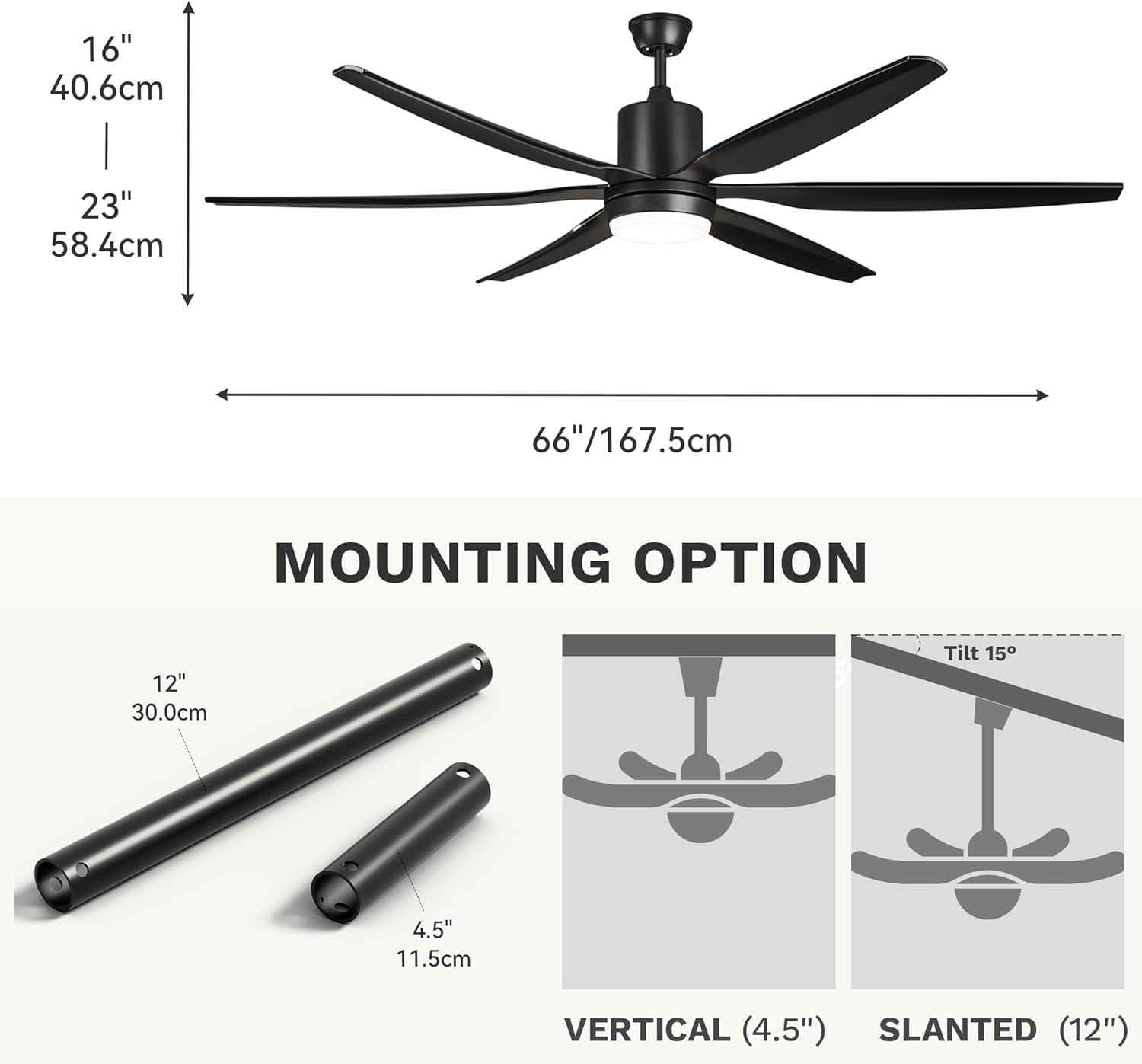66 inch Ceiling Fan: This large ceiling fan with light provides more wind power as well as covers a larger area for enhanced air circulation when compared to a 52 inch ceiling fan. It also comes with two hanging rods (4.5″ and 12″) for rooms or living rooms with different ceiling heights