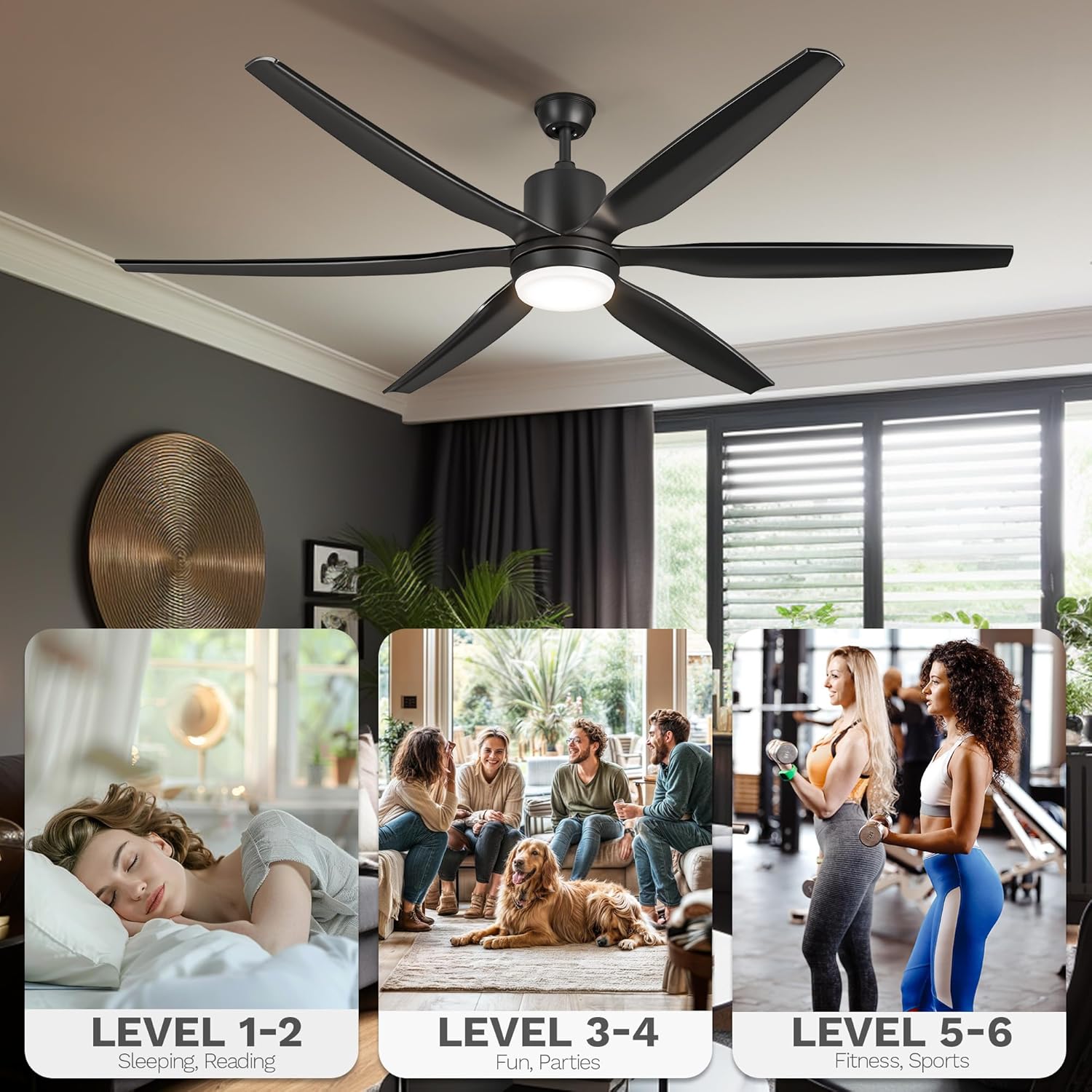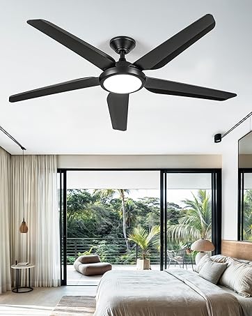 Quiet Reversible DC Motor: This 66 inch ceiling fan with light has a pure copper DC motor that runs smoothly compared to AC motors, and also delivers powerful airflow at a low noise level of less than 35 decibels. The motor’s reversible mode keeps you comfortable all year round: in the summer, it blows downward to cool the air, and in the winter, it pushes upward to promote air circulation