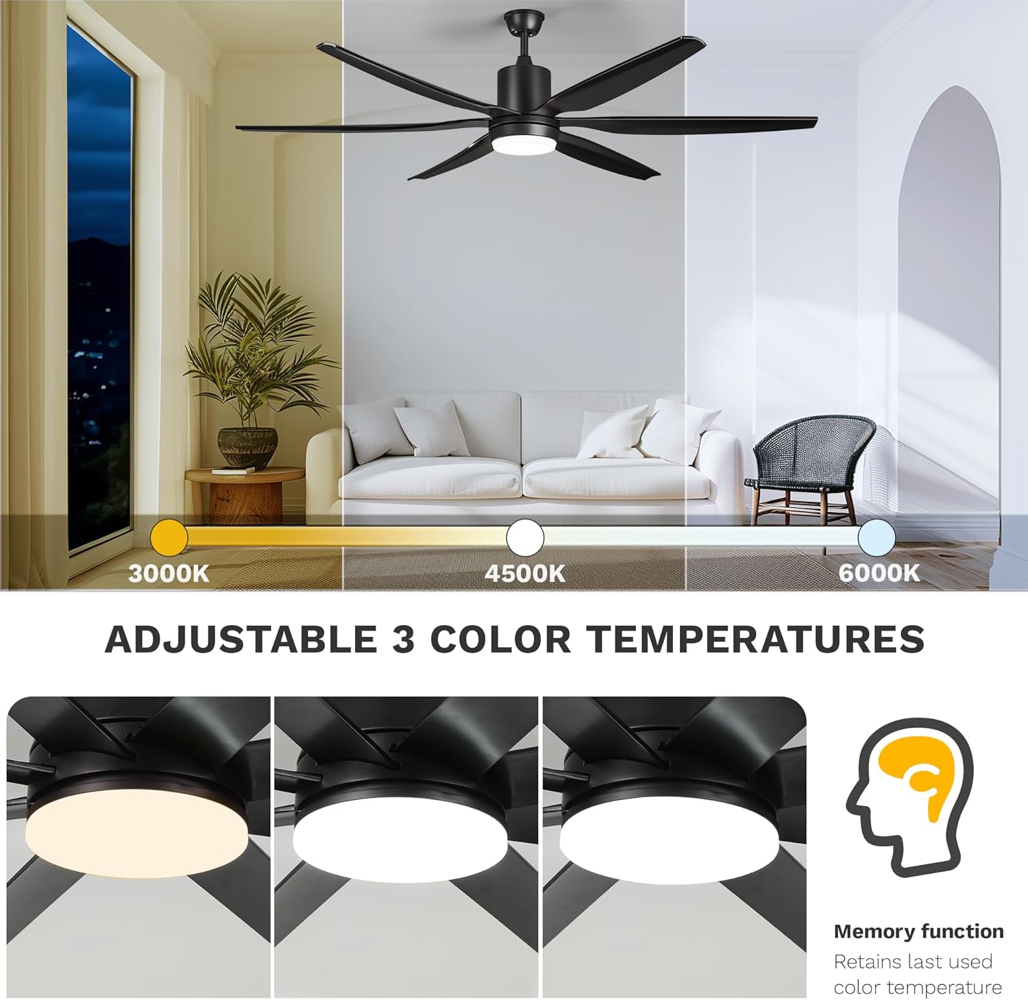 3 CCT Choices & Memory Functions: This black ceiling fan offers 3 color temperature choices: 3000K Warm White, 4500K Natural White and 6000K Cool White. It also has a memory function: when you turn off the light and wait 10 seconds to turn it back on, it will still be the same color temperature as the last time you turned it on
